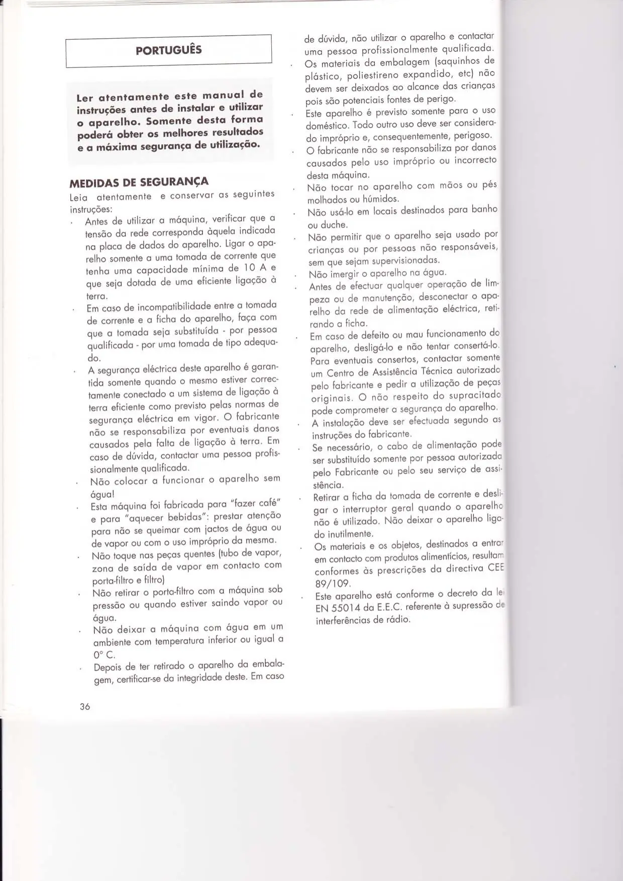 Em coso de incompotibilidode entre o tomodo de corrente e o ficho do oporelho, foço com quolificodo - por umo tomodo de tipo odequodo. A seguronÇo eléctrico deste oporelho é gorontido somente quondo o mesmo estiver correcà tomente conectodo o um sistemo de ligoçôo originois. O nôo resPeito do suprocil:d' poj" comprometer o seguronço do oporelho' A instoloçôo deve ser efectuodo segundo os terro efiiciente como previsto pelos normos de seguronço eléctrico em vigor. O fobriconte nôo se responsobilizo Por eventuois donos cousodos pelo folto de ligoçôo à terro. Em coso de d,jvido, contoctor umo pessoo profissionolmente quolificodo' . Nôo colocor o funcionor o oporelho Esto môquino foi fobricodo Poro "lozer cofé"