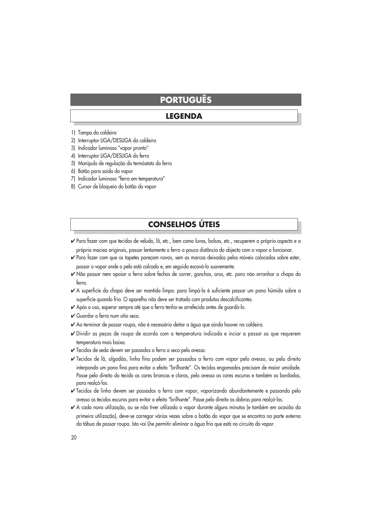 Tampa da caldeira Interruptor LIGA/DESLIGA da caldeira Indicador luminoso “vapor pronto” Interruptor LIGA/DESLIGA do ferro Manípulo de regulação do termóstato do ferro Botão para saida do vapor Indicador luminoso “ferro em temperatura” Cursor de bloqueio do botão do vapor CONSELHOS ÚTEIS ✔ Para fazer com que tecidos de veludo, lã, etc., bem como luvas, bolsas, etc., recuperem o próprio aspecto e a própria maciez originais, passar lentamente o ferro a pouca distância do objecto com o vapor a funcionar. ✔ Para fazer com que os tapetes pareçam novos, sem as marcas deixadas pelos móveis colocados sobre ester, passar o vapor onde o pelo está calcado e, em seguida escová-lo suavemente. ✔ Não passar nem apoiar o ferro sobre fechos de correr, ganchos, aros, etc. para náo arranhar a chapa do ferro. ✔ A superficíe da chapa deve ser mantida limpa: para limpá-la é suficiente passar um pano hümido sobre a superficíe quando fria. O aparelho não deve ser tratado com produtos descalcificantes. ✔ Após o uso, esperar sempre até que o ferro tenha-se arrefecido antes de guardá-lo. ✔ Guardar o ferro num sítio seco. ✔ Ao terminar de passar roupa, não é necessário deitar a água que ainda houver na caldeira. ✔ Dividir as peças de roupa de acordo com a temperatura indicada e inciar a passar as que requerem temperatura mais baixa. ✔ Tecidos de seda devem ser passados a ferro a seco pelo avesso. ✔ Tecidos de lã, algodão, linho fino podem ser passados a ferro com vapor pelo avesso, ou pelo direito interpondo um pano fino para evitar o efeito “brilhante”. Os tecidos engomados precisam de maior umidade. Passe pelo direito do tecido as cores brancas e claras, pelo avesso as cores escuras e também os bordados, para realçá-los. ✔ Tecidos de linho devem ser passados a ferro com vapor, vaporizando abundantemente e passando pelo avesso os tecidos escuros para evitar o efeito “brilhante”. Passe pelo direito as dobras para realçá-las. ✔ A cada nova utilização, ou se não tiver utilizado o vapor durante alguns minutos (e também em ocasião da primeira utilização), deve-se carregar várias vezes sobre o botão do vapor que se encontra na parte externa da tábua de passar roupa. Isto vai Lhe permitir eliminar a água fria que está no circuito do vapor.