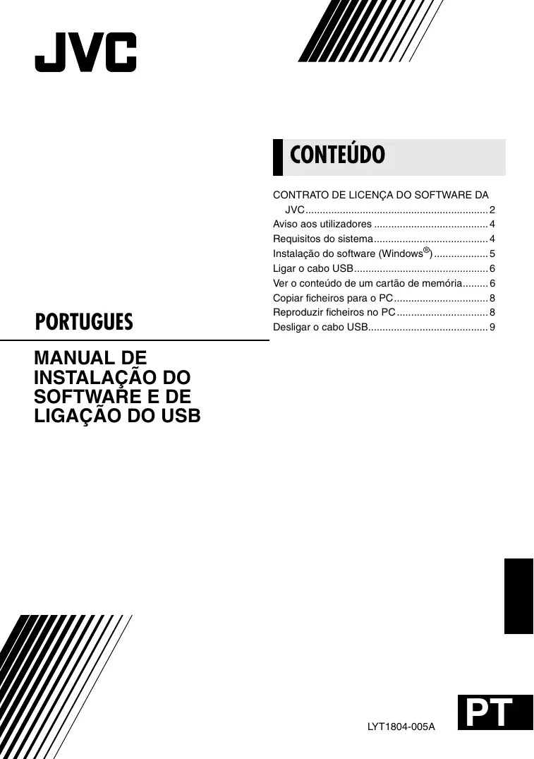 Näo se esqueça de que, consoante o problema descrito, pode ter de aguardar älgum tempo até obter as respostas de que necessita. A JVC näo poderä responder a perguntas referentes ao funcionamento bäsico do PC nem a perguntas referentes a especificaçôes nem ao desempenho do SO, de outras aplicaçôes ou controladores. e As informaçôes de requisitos de sistema especificadas acima nâo garantem que o software fornecido funcione em todos os computadores pessoais que satistaçam estes requisitos. e Se o PC nâo satisfizer os requisitos de sistema especificados acima, pode utilizar © dispositivo de leitura/escrita USB CU- VUSD70 opcional, a adaptador de disquete PC Card CU-VPSD60 ou a adaptador de disquetes CU-VFSD50 para carregar os ficheiros do cartäo de memôria para 0 disco rigido do PC. (Consulte “JVC Accessories” no nosso site da web em: http:/wwuwr.jve- victor.co.jp/english/accessory/) e Windows® 6 uma marca registada ou marca comercial da Microsoft Corporation, nos Estados Unidos e/ou em outros paises. e Macintosh é uma marca registada da Apple Computer, Inc. « Outros produtos e nomes de empresas incluidos neste manual de instruçôes säo marcas comerciais e/ou marcas registadas dos respectivos proprietärios.