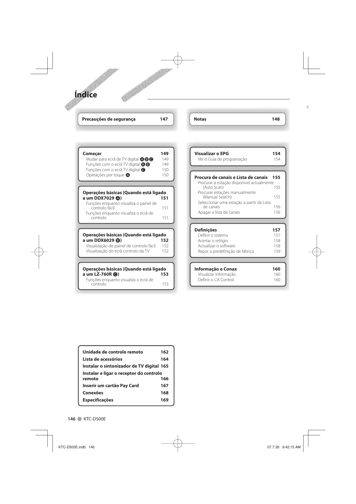 Unidade de controlo remoto 162 Lista de acessórios 164 Instalar o sintonizador de TV digital 165 Instalar e ligar o receptor do controlo remoto 166 Inserir um cartão Pay Card 167 Conexões 168 Especificações 169