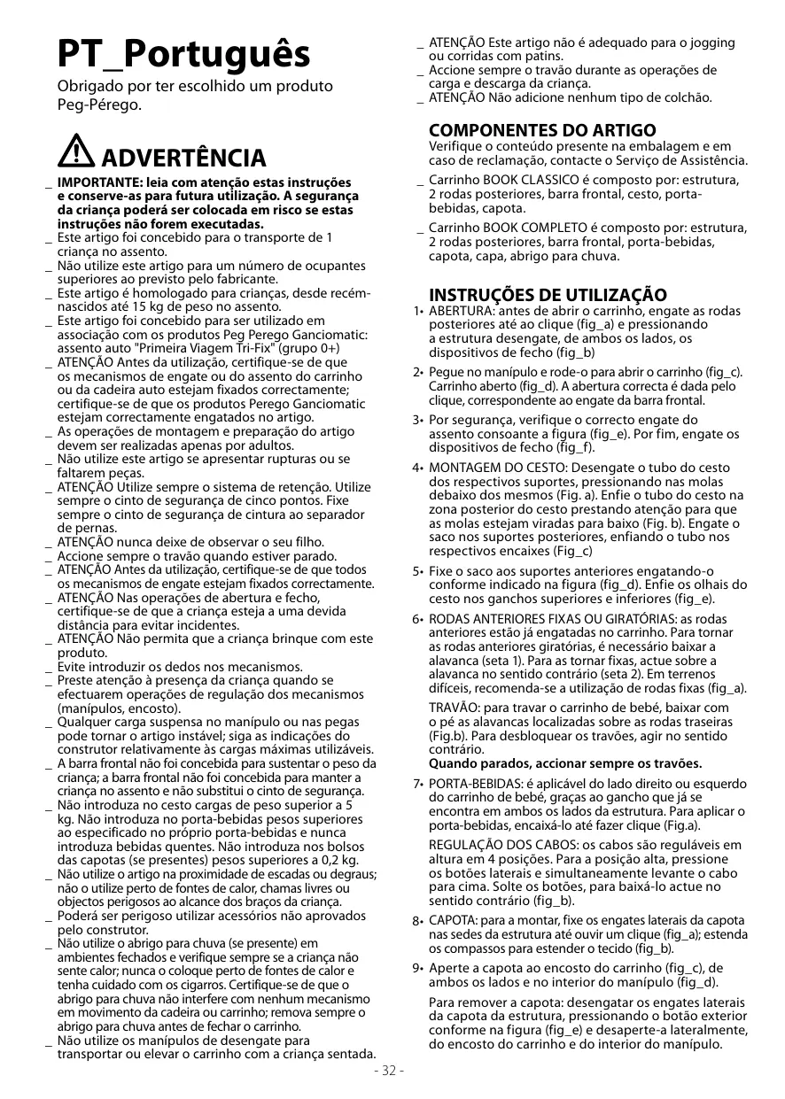 _ Ne pas utiliser lorsque le nombre d’occupants est supérieur aux prescriptions du fabricant. _ Cet article est homologué pour des enfants dans le siège de la naissance jusqu’à un poids de 15 kg. _ Cet article a été conçu pour être utilisé avec les articles Peg Perego Ganciomatic : siège-auto "Primo Viaggio TriFix" (groupe 0+) _ ATTENTION Avant l’utilisation, s’assurer que les mécanismes de fixation du siège ou de l’assise de la poussette ou bien du siège-auto sont accrochés correctement ; s’assurer que les produits Peg Perego Ganciomatic sont correctement accrochés à l'article. _ Les opérations d’assemblage et de préparation de l’article doivent être effectuées par des adultes. _ Ne pas utiliser cet article si des pièces sont manquantes ou cassées. _ ATTENTION Toujours utiliser le système de retenue. Toujours utiliser la ceinture de sécurité à cinq points. Toujours accrocher la ceinture ventrale à la sangle d’entrejambes. _ ATTENTION ne jamais laisser sans surveillance l’enfant. _ Actionner toujours le frein à l’arrêt. _ ATTENTION Avant l’utilisation, s’assurer que tous les mécanismes de fixation sont correctement accrochés. _ ATTENTION Dans les opérations d’ouverture et de fermeture, s’assurer que l’enfant est à bonne distance pour éviter qu’il se blesse. _ ATTENTION Ne pas laisser l’enfant jouer avec ce produit. _ Éviter de mettre les doigts dans les mécanismes. _ Prêter attention à la position de l’enfant lors des opérations de réglage des éléments mobiles (poignée, dossier). _ Toute charge pendue aux poignées peut rendre l’article instable ; se conformer aux indications du fabricant relatives aux charges maximales admises. _ La barre frontale n’a pas été conçue pour supporter le poids de l’enfant ; elle n’a pas non plus été conçue pour maintenir l’enfant en position assise et ne remplace pas la sangle de sécurité. _ Ne pas utiliser le panier pour transporter des charges supérieures à 5 kg. Ne pas introduire dans le porteboissons des charges supérieures à celles indiquées sur le porte-boissons lui-même ; ne jamais y introduire de boissons chaudes. Ne pas introduire dans les poches de la capote (lorsqu’elles sont présentes) des objets dont le poids excède 0,2 kg. _ Ne pas utiliser l’article à proximité d’escaliers ou de marches ; ne pas l’utiliser à proximité de sources de chaleur, de flammes directes ou d’objets dangereux se trouvant à la portée de l’enfant. _ L’utilisation d’accessoires n’ayant pas été approuvés par le fabricant peut se révéler dangereuse. _ Ne pas utiliser l’habillage pluie dans des lieux clos et contrôler régulièrement que l’enfant n’a pas trop chaud