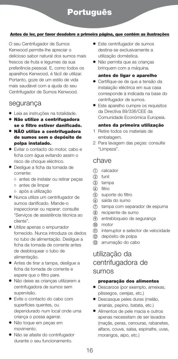 Se o cabo estiver danificado, por razões de segurança, deverá ser substituído pela KENWOOD ou num posto de assistência técnica autorizado pela KENWOOD. Se precisar de ajuda no que se refere a: como utilizar o centrifugador de sumos, ou assistência ou reparações Contacte o estabelecimento onde comprou o seu centrifugador de sumos.
