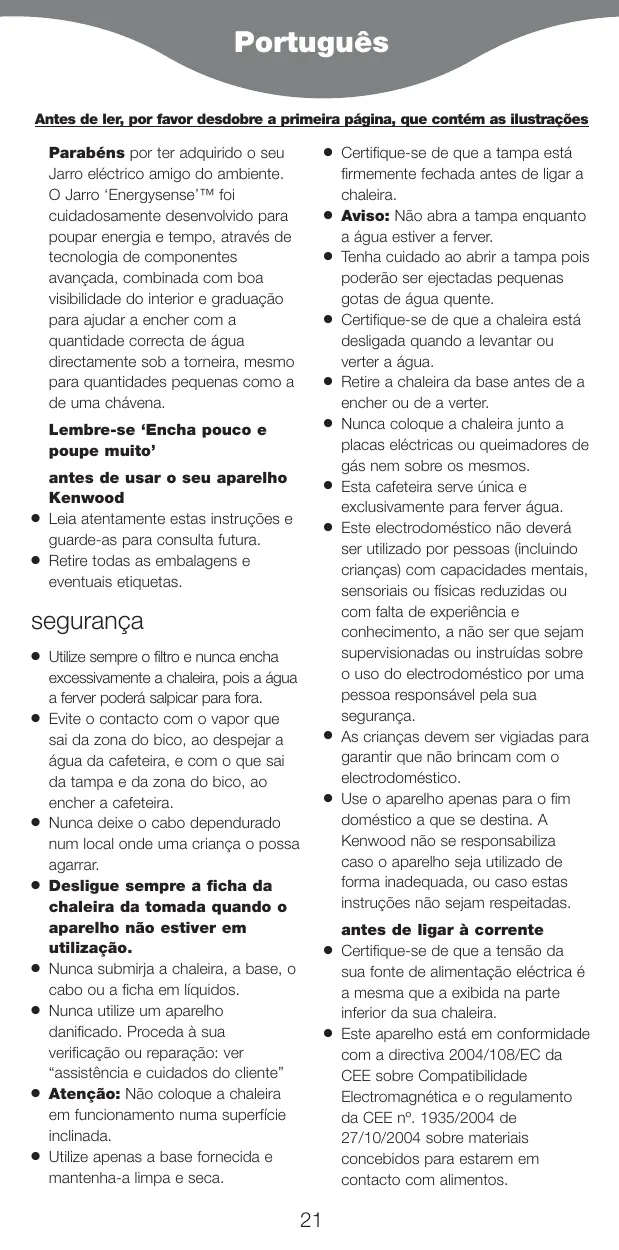 Certifique-se de que a tampa está firmemente fechada antes de ligar a chaleira. Aviso: Não abra a tampa enquanto a água estiver a ferver. Tenha cuidado ao abrir a tampa pois poderão ser ejectadas pequenas gotas de água quente. Certifique-se de que a chaleira está desligada quando a levantar ou verter a água. Retire a chaleira da base antes de a encher ou de a verter. Nunca coloque a chaleira junto a placas eléctricas ou queimadores de gás nem sobre os mesmos. Esta cafeteira serve única e exclusivamente para ferver água. Este electrodoméstico não deverá ser utilizado por pessoas (incluindo crianças) com capacidades mentais, sensoriais ou físicas reduzidas ou com falta de experiência e conhecimento, a não ser que sejam supervisionadas ou instruídas sobre o uso do electrodoméstico por uma pessoa responsável pela sua segurança. As crianças devem ser vigiadas para garantir que não brincam com o electrodoméstico. Use o aparelho apenas para o fim doméstico a que se destina. A Kenwood não se responsabiliza caso o aparelho seja utilizado de forma inadequada, ou caso estas instruções não sejam respeitadas. antes de ligar à corrente Certifique-se de que a tensão da sua fonte de alimentação eléctrica é a mesma que a exibida na parte inferior da sua chaleira. Este aparelho está em conformidade com a directiva 2004/108/EC da CEE sobre Compatibilidade Electromagnética e o regulamento da CEE nº. 1935/2004 de 27/10/2004 sobre materiais concebidos para estarem em contacto com alimentos. antes de utilizar pela primeira vez 1 Ajuste o comprimento do fio eléctrico – rode a base na direcção dos ponteiros do relógio para alongar o fio, e na direcção contrária à dos ponteiros do relógio para encurtar o fio . 2 Encha de água até à marca “MAX”, ferva-a, depois despeje-a. Repita 2 a 3 vezes.