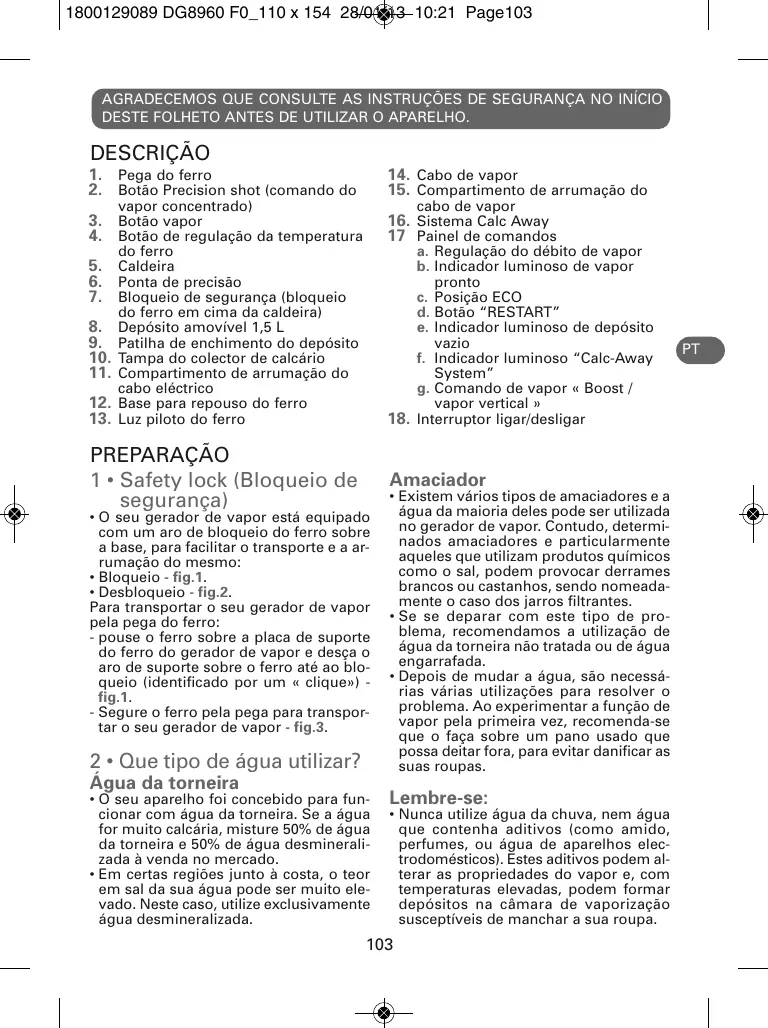 - Desbloqueio - fig.2. Para transportar o seu gerador de vapor pela pega do ferro: - pouse o ferro sobre a placa de suporte do ferro do gerador de vapor e desça o aro de suporte sobre o ferro até ao bloqueio (identificado por um « clique») fig.1. - Segure o ferro pela pega para transportar o seu gerador de vapor - fig.3. 2 • Que tipo de água utilizar? Água da torneira