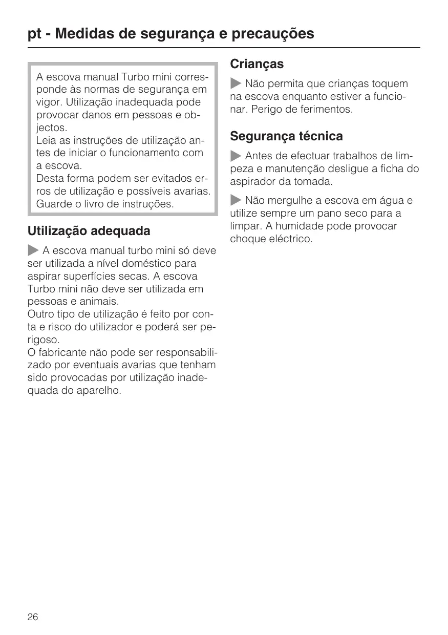 pt - Medidas de segurança e precauções Crianças A escova manual Turbo mini corresponde às normas de segurança em vigor. Utilização inadequada pode provocar danos em pessoas e objectos. Leia as instruções de utilização antes de iniciar o funcionamento com a escova. Desta forma podem ser evitados erros de utilização e possíveis avarias. Guarde o livro de instruções.