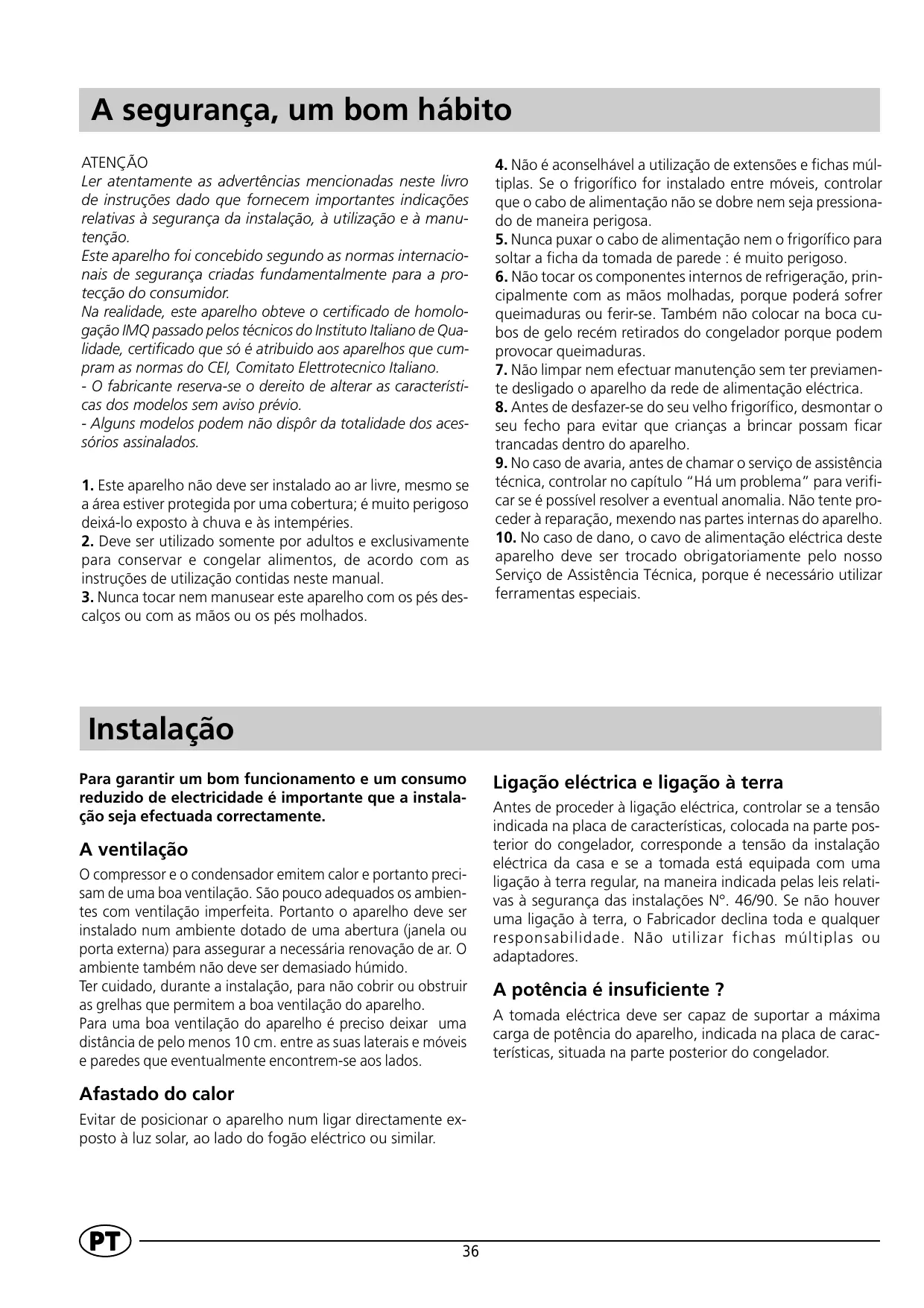 Avant de procéder à tout raccordement électrique, contrôlez si le voltage indiqué sur la plaquette des caractéristiques, placée dans la partie arrière du congélateur, correspond bien à celui de votre installation et contrôlez si la prise est dotée d’une mise à la terre conforme, comme prescrit par la loi 46/90 sur la sécurité des installations. S’il n’y a pas de mise à la terre, le Fabricant décline toute responsabilité. N’utilisez ni prises multiples ni adaptateurs.