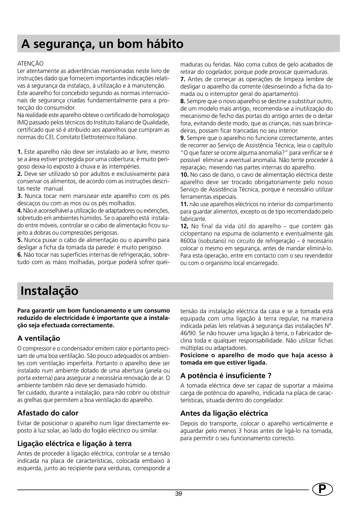 située à l'intérieur du congélateur, correspond bien à celui de votre installation et contrôlez si la prise est dotée d’une mise à la terre conforme, comme prescrit par la loi 46/90 sur la sécurité des installations. S’il n’y a pas de mise à la terre, le Fabricant décline toute responsabilité. N’utilisez ni prises multiples ni adaptateurs.