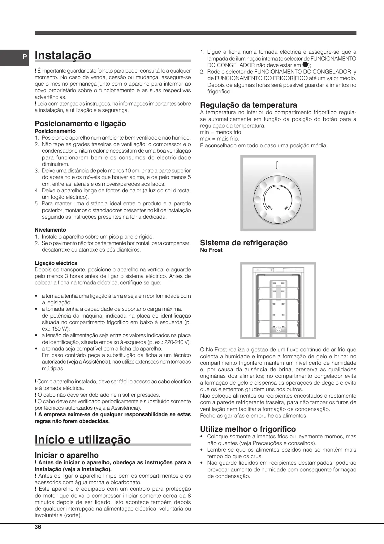 Ligação eléctrica Depois do transporte, posicione o aparelho na vertical e aguarde pelo menos 3 horas antes de ligar o sistema eléctrico. Antes de colocar a ficha na tomada eléctrica, certifique-se que: • a tomada tenha uma ligação à terra e seja em conformidade com a legislação; • a tomada tenha a capacidade de suportar o carga máxima. de potência da máquina, indicada na placa de identificação situada no compartimento frigorífico em baixo à esquerda (p. ex.: 150 W); • a tensão de alimentação seja entre os valores indicados na placa de identificação, situada embaixo à esquerda (p. ex.: 220-240 V); • a tomada seja compatível com a ficha do aparelho. Em caso contrário peça a substituição da ficha a um técnico autorizado (veja a Assistência); não utilize extensões nem tomadas múltiplas. ! Com o aparelho instalado, deve ser fácil o acesso ao cabo eléctrico e à tomada eléctrica. ! O cabo não deve ser dobrado nem sofrer pressões. ! O cabo deve ser verificado periodicamente e substituído somente por técnicos autorizados (veja a Assistência). ! A empresa exime-se de qualquer responsabilidade se estas regras não forem obedecidas.