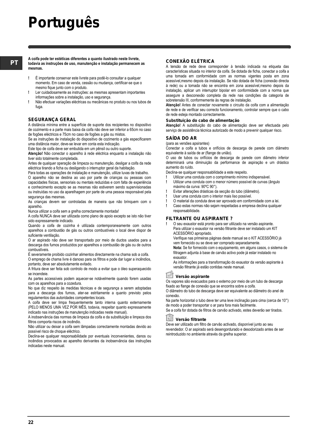 Se declina cada responsabilidad. ! Utilice un conducto cuya longitud sea la mínima indispensable. ! Utilice un conducto con el menor número posible de curvas (ángulo máximo de la curva: 90°). Las informaciones para la transformación de la campana en versión aspirante a versión filtrante ya están presentes en este manual.