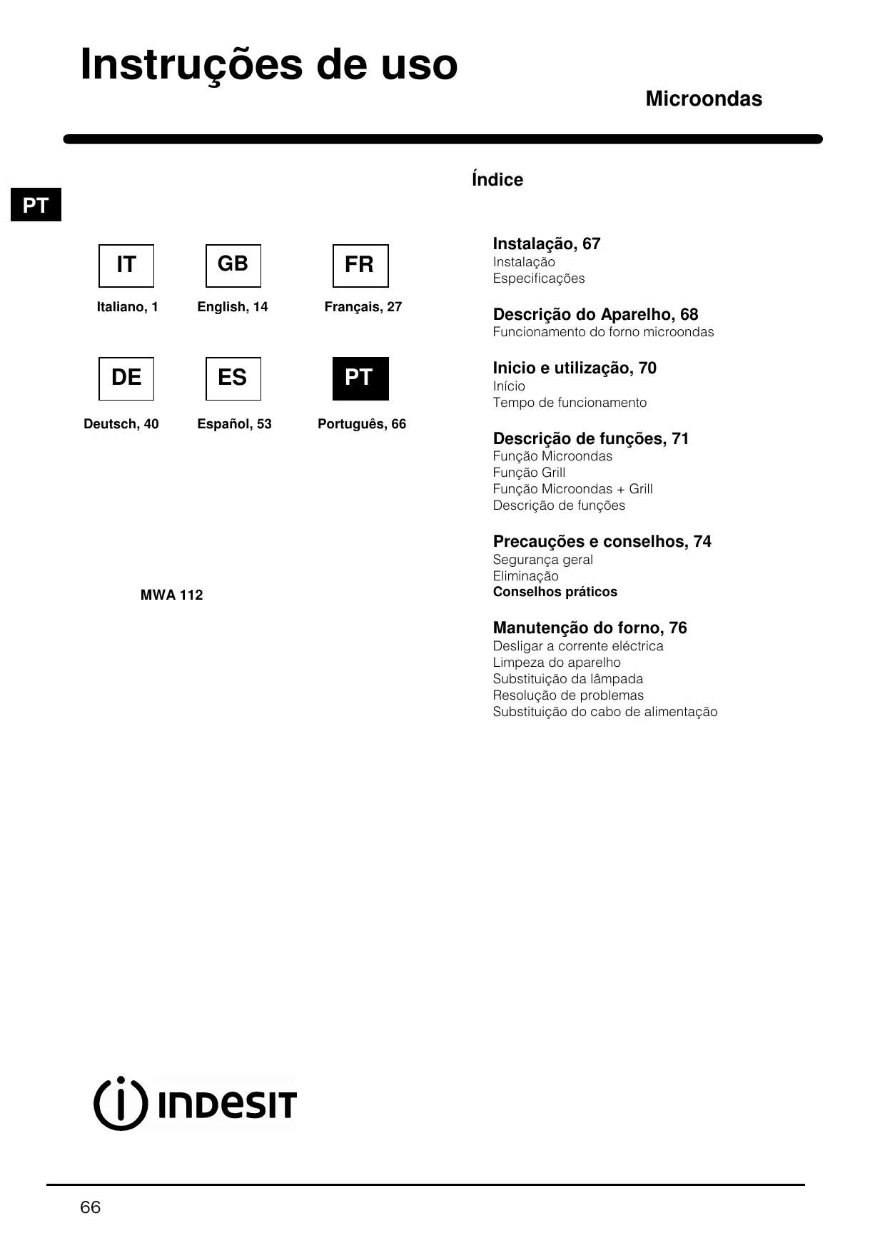 Español, 53 Português, 66 Inicio e utilização, 70 Início Tempo de funcionamento Descrição de funções, 71 Função Microondas Função Grill Função Microondas + Grill Descrição de funções Precauções e conselhos, 74 MWA 112 Segurança geral Eliminação Conselhos práticos Manutenção do forno, 76 Desligar a corrente eléctrica Limpeza do aparelho Substituição da lâmpada Resolução de problemas Substituição do cabo de alimentação