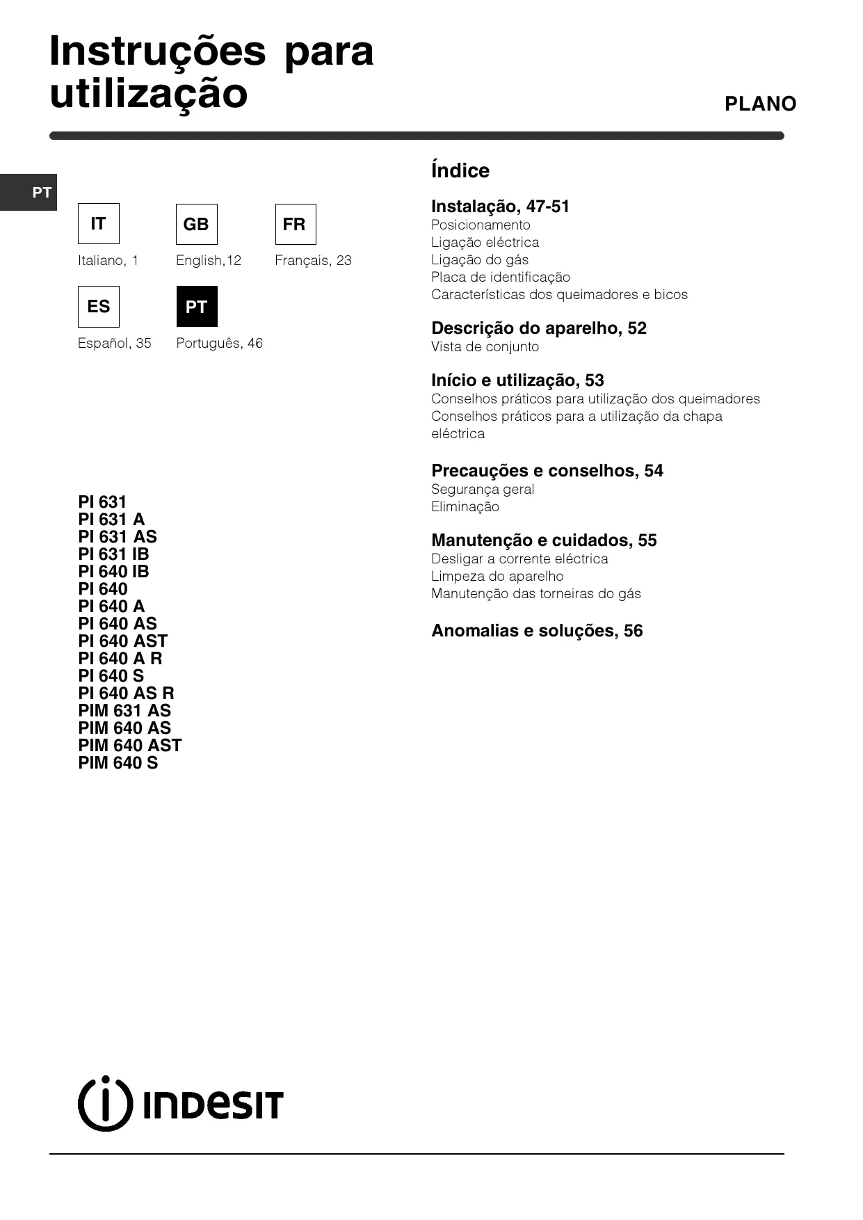 Encontre gratuitamente o manual do aparelho PIM631AS INDESIT em formato PDF.