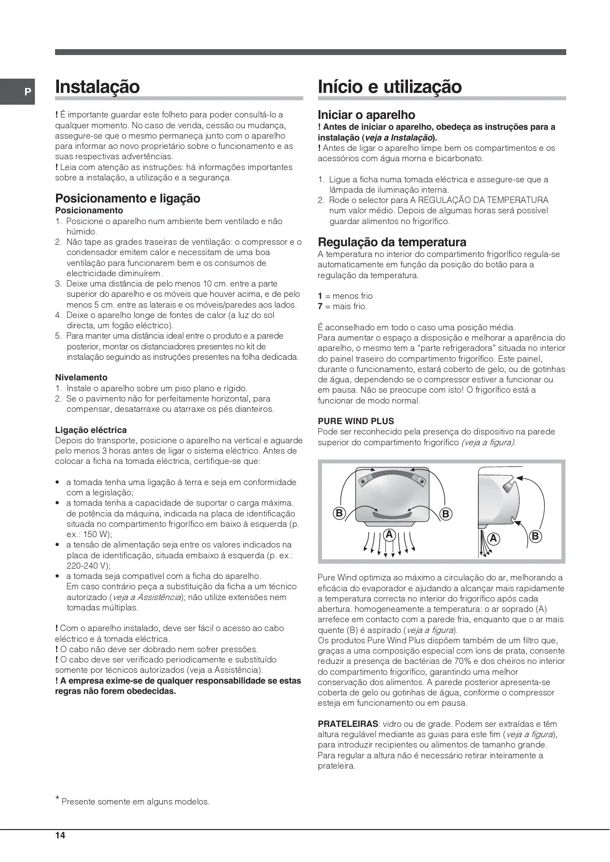 Os produtes Pure Wind Plus dispôem também de um firo que, graças a uma composiçäo especial com ions de prata, consente reduzir a presença de bactérias de 70% e dos cheiros no interior do compartimento frigorifico, garantindo uma melhor conservaçäo dos alimentos. À parede posterior apresenta-se coberta de gelo ou goïinhas de gua, conforme o compressor esteja em funcionamento ou em pausa