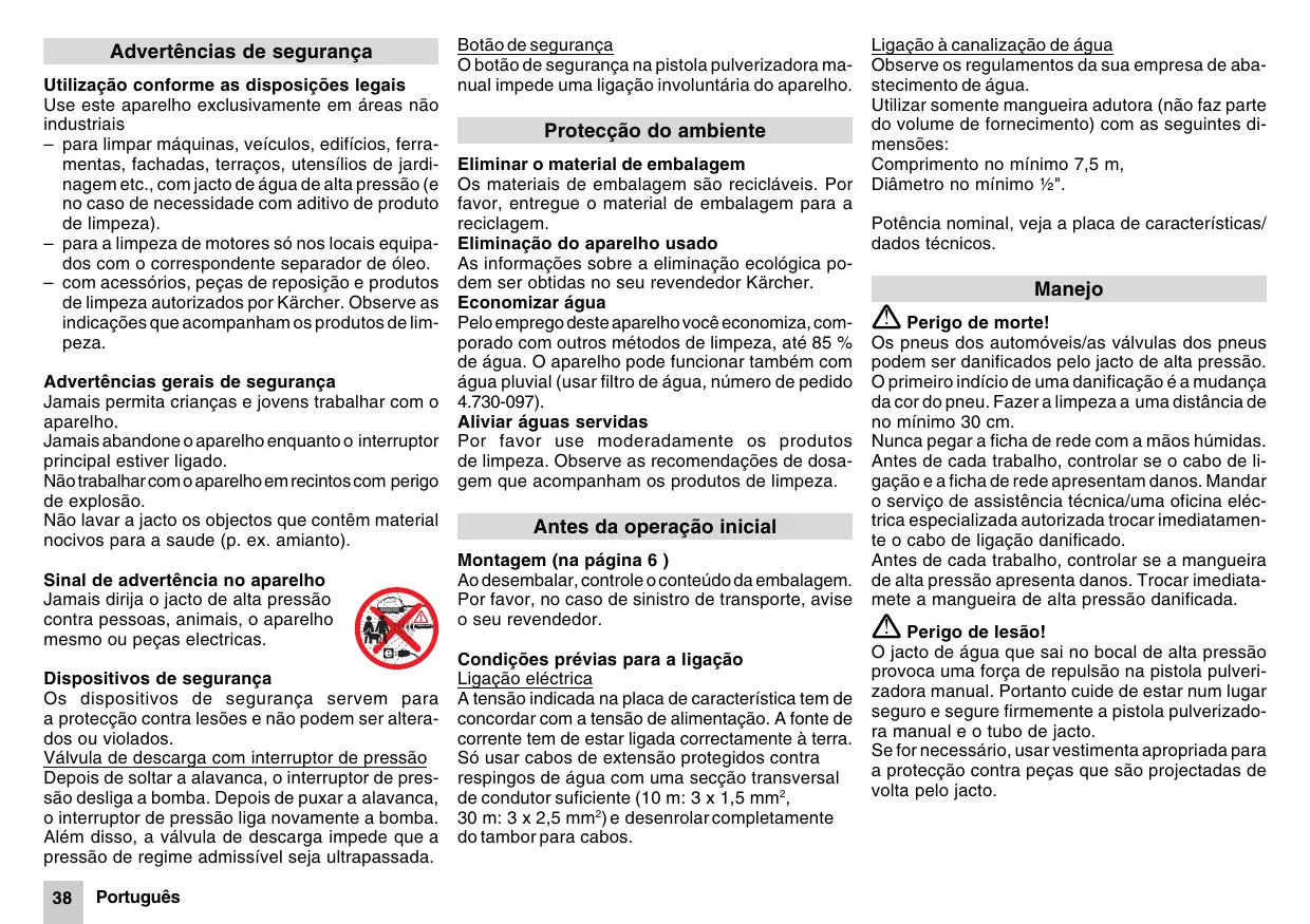 - 79 : 1998 : 1999 : 1997 - 2 : 1995 - 3 : 2000 Mediante una serie de medidas internas, queda asegurado que los aparatos y equipos de serie cumplan siempre las exigencias formuladas en las directivas comunitarias actuales y en las normas correspondientes a aplicar. Los firmantes actúan autorizados y con poder otorgado por la dirección de la empresa. Alfred Kärcher GmbH & Co. Cleaning Systems Alfred-Kärcher-Str. 28–40 P.O. Box 160 D-71349 Winnenden Español 37 Advertências de segurança Utilização conforme as disposições legais Use este aparelho exclusivamente em áreas não industriais – para limpar máquinas, veículos, edifícios, ferramentas, fachadas, terraços, utensílios de jardinagem etc., com jacto de água de alta pressão (e no caso de necessidade com aditivo de produto de limpeza). – para a limpeza de motores só nos locais equipados com o correspondente separador de óleo. – com acessórios, peças de reposição e produtos de limpeza autorizados por Kärcher. Observe as indicações que acompanham os produtos de limpeza. Advertências gerais de segurança Jamais permita crianças e jovens trabalhar com o aparelho. Jamais abandone o aparelho enquanto o interruptor principal estiver ligado. Não trabalhar com o aparelho em recintos com perigo de explosão. Não lavar a jacto os objectos que contêm material nocivos para a saude (p. ex. amianto). Sinal de advertência no aparelho Jamais dirija o jacto de alta pressão contra pessoas, animais, o aparelho mesmo ou peças electricas. Dispositivos de segurança Os dispositivos de segurança servem para a protecção contra lesões e não podem ser alterados ou violados. Válvula de descarga com interruptor de pressão Depois de soltar a alavanca, o interruptor de pressão desliga a bomba. Depois de puxar a alavanca, o interruptor de pressão liga novamente a bomba. Além disso, a válvula de descarga impede que a pressão de regime admissível seja ultrapassada.