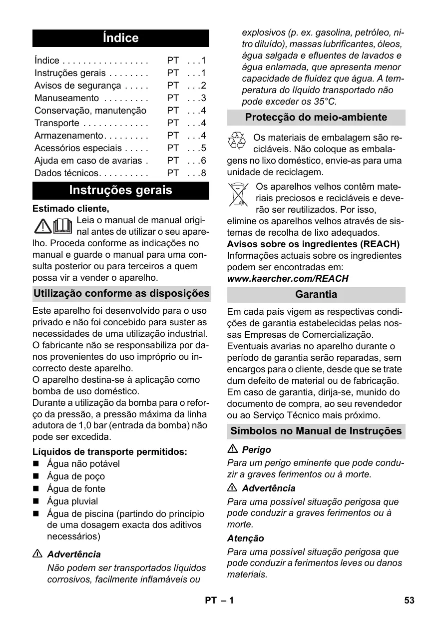 Protecção do meio-ambiente Os materiais de embalagem são recicláveis. Não coloque as embalagens no lixo doméstico, envie-as para uma unidade de reciclagem. Estimado cliente, Leia o manual de manual original antes de utilizar o seu aparelho. Proceda conforme as indicações no manual e guarde o manual para uma consulta posterior ou para terceiros a quem possa vir a vender o aparelho. Os aparelhos velhos contêm materiais preciosos e recicláveis e deverão ser reutilizados. Por isso, elimine os aparelhos velhos através de sistemas de recolha de lixo adequados. Avisos sobre os ingredientes (REACH) Informações actuais sobre os ingredientes podem ser encontradas em: www.kaercher.com/REACH Utilização conforme as disposições Garantia Este aparelho foi desenvolvido para o uso privado e não foi concebido para suster as necessidades de uma utilização industrial. O fabricante não se responsabiliza por danos provenientes do uso impróprio ou incorrecto deste aparelho. O aparelho destina-se à aplicação como bomba de uso doméstico. Durante a utilização da bomba para o reforço da pressão, a pressão máxima da linha adutora de 1,0 bar (entrada da bomba) não pode ser excedida. Em cada país vigem as respectivas condições de garantia estabelecidas pelas nossas Empresas de Comercialização. Eventuais avarias no aparelho durante o período de garantia serão reparadas, sem encargos para o cliente, desde que se trate dum defeito de material ou de fabricação. Em caso de garantia, dirija-se, munido do documento de compra, ao seu revendedor ou ao Serviço Técnico mais próximo. Instruções gerais Líquidos de transporte permitidos: Água não potável Água de poço Água de fonte Água pluvial Água de piscina (partindo do princípio de uma dosagem exacta dos aditivos necessários) 몇 Advertência Não podem ser transportados líquidos corrosivos, facilmente inflamáveis ou Símbolos no Manual de Instruções Perigo Para um perigo eminente que pode conduzir a graves ferimentos ou à morte. 몇 Advertência Para uma possível situação perigosa que pode conduzir a graves ferimentos ou à morte. Atenção Para uma possível situação perigosa que pode conduzir a ferimentos leves ou danos materiais. PT – 1