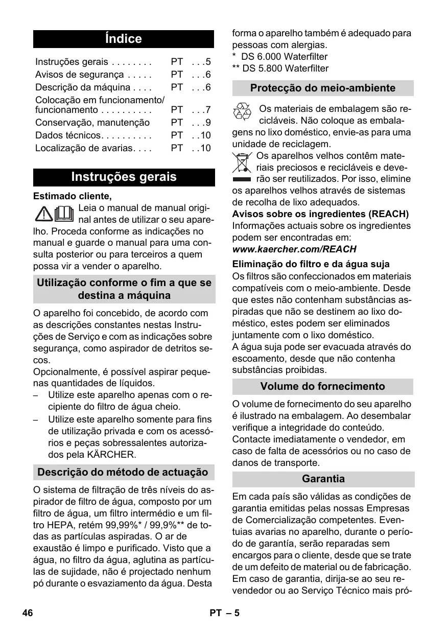 Instruções gerais Estimado cliente, Leia o manual de manual original antes de utilizar o seu aparelho. Proceda conforme as indicações no manual e guarde o manual para uma consulta posterior ou para terceiros a quem possa vir a vender o aparelho. Utilização conforme o fim a que se destina a máquina O aparelho foi concebido, de acordo com as descrições constantes nestas Instruções de Serviço e com as indicações sobre segurança, como aspirador de detritos secos. Opcionalmente, é possível aspirar pequenas quantidades de líquidos. – Utilize este aparelho apenas com o recipiente do filtro de água cheio. – Utilize este aparelho somente para fins de utilização privada e com os acessórios e peças sobressalentes autorizados pela KÄRCHER. Descrição do método de actuação O sistema de filtração de três níveis do aspirador de filtro de água, composto por um filtro de água, um filtro intermédio e um filtro HEPA, retém 99,99%* / 99,9%** de todas as partículas aspiradas. O ar de exaustão é limpo e purificado. Visto que a água, no filtro da água, aglutina as partículas de sujidade, não é projectado nenhum pó durante o esvaziamento da água. Desta