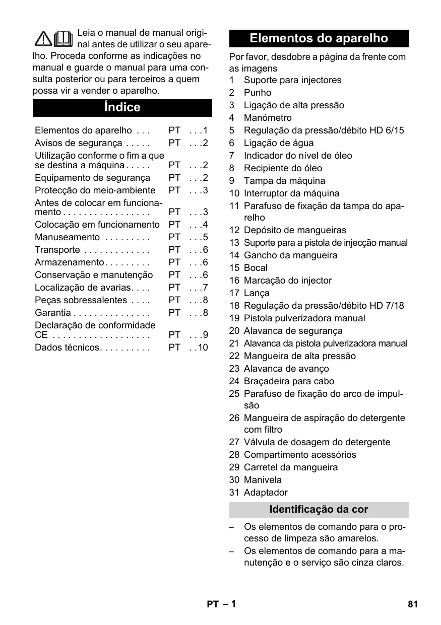 PT . . .9 PT . .10 Elementos do aparelho Por favor, desdobre a página da frente com as imagens 1 Suporte para injectores 2 Punho 3 Ligação de alta pressão 4 Manómetro 5 Regulação da pressão/débito HD 6/15 6 Ligação de água 7 Indicador do nível de óleo 8 Recipiente do óleo 9 Tampa da máquina 10 Interruptor da máquina 11 Parafuso de fixação da tampa do aparelho 12 Depósito de mangueiras 13 Suporte para a pistola de injecção manual 14 Gancho da mangueira 15 Bocal 16 Marcação do injector 17 Lança 18 Regulação da pressão/débito HD 7/18 19 Pistola pulverizadora manual 20 Alavanca de segurança 21 Alavanca da pistola pulverizadora manual 22 Mangueira de alta pressão 23 Alavanca de avanço 24 Braçadeira para cabo 25 Parafuso de fixação do arco de impulsão 26 Mangueira de aspiração do detergente com filtro 27 Válvula de dosagem do detergente 28 Compartimento acessórios 29 Carretel da mangueira 30 Manivela 31 Adaptador Identificação da cor