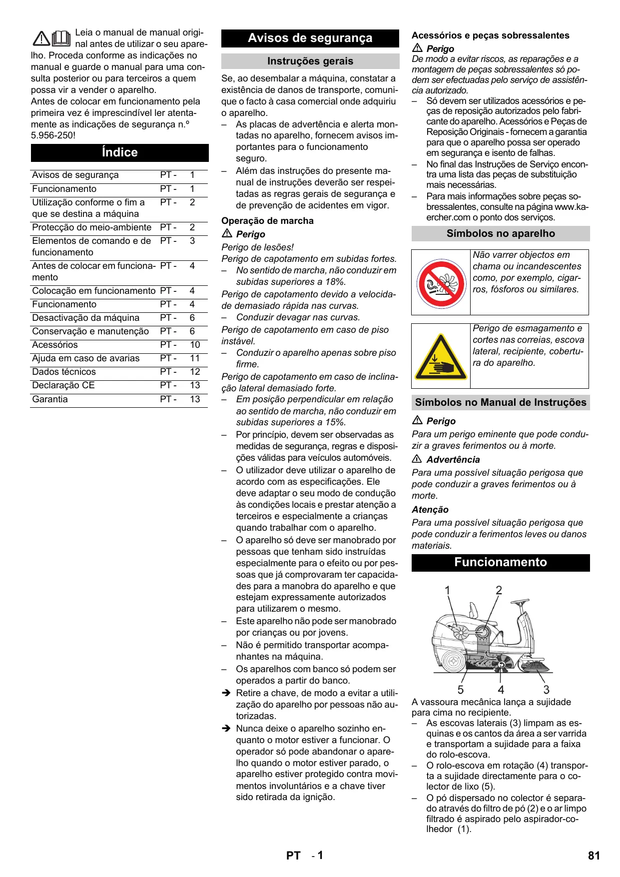 Avisos de segurança Instruções gerais Se, ao desembalar a máquina, constatar a existência de danos de transporte, comunique o facto à casa comercial onde adquiriu o aparelho. – As placas de advertência e alerta montadas no aparelho, fornecem avisos importantes para o funcionamento seguro. – Além das instruções do presente manual de instruções deverão ser respeitadas as regras gerais de segurança e de prevenção de acidentes em vigor. Operação de marcha Perigo Perigo de lesões! Perigo de capotamento em subidas fortes. – No sentido de marcha, não conduzir em subidas superiores a 18%. Perigo de capotamento devido a velocidade demasiado rápida nas curvas. – Conduzir devagar nas curvas. Perigo de capotamento em caso de piso instável. – Conduzir o aparelho apenas sobre piso firme. Perigo de capotamento em caso de inclinação lateral demasiado forte. – Em posição perpendicular em relação ao sentido de marcha, não conduzir em subidas superiores a 15%. – Por princípio, devem ser observadas as medidas de segurança, regras e disposições válidas para veículos automóveis. – O utilizador deve utilizar o aparelho de acordo com as especificações. Ele deve adaptar o seu modo de condução às condições locais e prestar atenção a terceiros e especialmente a crianças quando trabalhar com o aparelho. – O aparelho só deve ser manobrado por pessoas que tenham sido instruídas especialmente para o efeito ou por pessoas que já comprovaram ter capacidades para a manobra do aparelho e que estejam expressamente autorizados para utilizarem o mesmo. – Este aparelho não pode ser manobrado por crianças ou por jovens. – Não é permitido transportar acompanhantes na máquina. – Os aparelhos com banco só podem ser operados a partir do banco. Î Retire a chave, de modo a evitar a utilização do aparelho por pessoas não autorizadas. Î Nunca deixe o aparelho sozinho enquanto o motor estiver a funcionar. O operador só pode abandonar o aparelho quando o motor estiver parado, o aparelho estiver protegido contra movimentos involuntários e a chave tiver sido retirada da ignição. PT - 1 Acessórios e peças sobressalentes Perigo De modo a evitar riscos, as reparações e a montagem de peças sobressalentes só podem ser efectuadas pelo serviço de assistência autorizado. – Só devem ser utilizados acessórios e peças de reposição autorizados pelo fabricante do aparelho. Acessórios e Peças de Reposição Originais - fornecem a garantia para que o aparelho possa ser operado em segurança e isento de falhas. – No final das Instruções de Serviço encontra uma lista das peças de substituição mais necessárias. – Para mais informações sobre peças sobressalentes, consulte na página www.kaercher.com o ponto dos serviços. Símbolos no aparelho Não varrer objectos em chama ou incandescentes como, por exemplo, cigarros, fósforos ou similares. Perigo de esmagamento e cortes nas correias, escova lateral, recipiente, cobertura do aparelho. Símbolos no Manual de Instruções Perigo Para um perigo eminente que pode conduzir a graves ferimentos ou à morte. 몇 Advertência Para uma possível situação perigosa que pode conduzir a graves ferimentos ou à morte. Atenção Para uma possível situação perigosa que pode conduzir a ferimentos leves ou danos materiais. Funcionamento A vassoura mecânica lança a sujidade para cima no recipiente. – As escovas laterais (3) limpam as esquinas e os cantos da área a ser varrida e transportam a sujidade para a faixa do rolo-escova. – O rolo-escova em rotação (4) transporta a sujidade directamente para o colector de lixo (5). – O pó dispersado no colector é separado através do filtro de pó (2) e o ar limpo filtrado é aspirado pelo aspirador-colhedor (1).