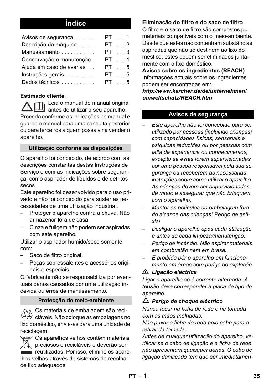 Eliminação do filtro e do saco de filtro O filtro e o saco de filtro são compostos por materiais compatíveis com o meio-ambiente. Desde que estes não contenham substâncias aspiradas que não se destinem ao lixo doméstico, estes podem ser eliminados juntamente com o lixo doméstico. Avisos sobre os ingredientes (REACH) Informações actuais sobre os ingredientes podem ser encontradas em: http://www.karcher.de/de/unternehmen/ umweltschutz/REACH.htm