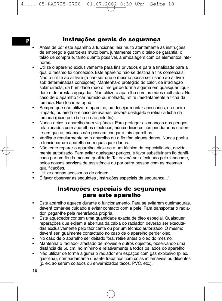 São necessários cuidados especiais, sempre que o aparelho seja utilizado na proximidade de crianças, ou quando o mesmo não se encontrar sob vigilância. Não introduzir quaisquer objectos no aparelho. Deverá manter-se uma distância adequada entre o fio de ligação à electricidade e a caixa do radiador. Para se evitar que o aparelho aqueça demais, deixar livre a entrada e saída do ar. Não pendurar nunca objectos à frente ou por cima do aparelho. Não usar o radiador ao ar livre. Este aparelho não é apropriado para ser utilizado em casas de banho, duches ou espaços semelhantes. Nunca colocar o radiador em sítios donde possa cair para dentro de uma banheira ou de outro recipiente de água. Não tapar o radiador. Não colocar o aparelho directamente por baixo de uma tomada. Utilizar o radiador apenas em posição vertical. No caso de o aparelho cair, retirar a ficha da tomada e deixá-lo arrefecer, antes de o tornar a pôr de pé.