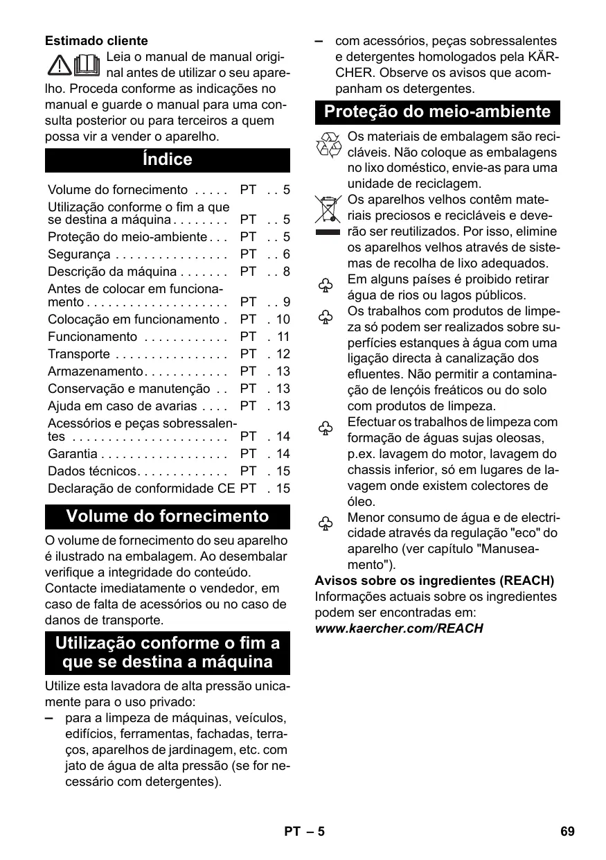 Proteção do meio-ambiente Os materiais de embalagem são recicláveis. Não coloque as embalagens no lixo doméstico, envie-as para uma unidade de reciclagem. Os aparelhos velhos contêm materiais preciosos e recicláveis e deverão ser reutilizados. Por isso, elimine os aparelhos velhos através de sistemas de recolha de lixo adequados. Em alguns países é proibido retirar água de rios ou lagos públicos. Os trabalhos com produtos de limpeza só podem ser realizados sobre superfícies estanques à água com uma ligação directa à canalização dos efluentes. Não permitir a contaminação de lençóis freáticos ou do solo com produtos de limpeza. Efectuar os trabalhos de limpeza com formação de águas sujas oleosas, p.ex. lavagem do motor, lavagem do chassis inferior, só em lugares de lavagem onde existem colectores de óleo. Menor consumo de água e de electricidade através da regulação "eco" do aparelho (ver capítulo "Manuseamento"). Avisos sobre os ingredientes (REACH) Informações actuais sobre os ingredientes podem ser encontradas em: