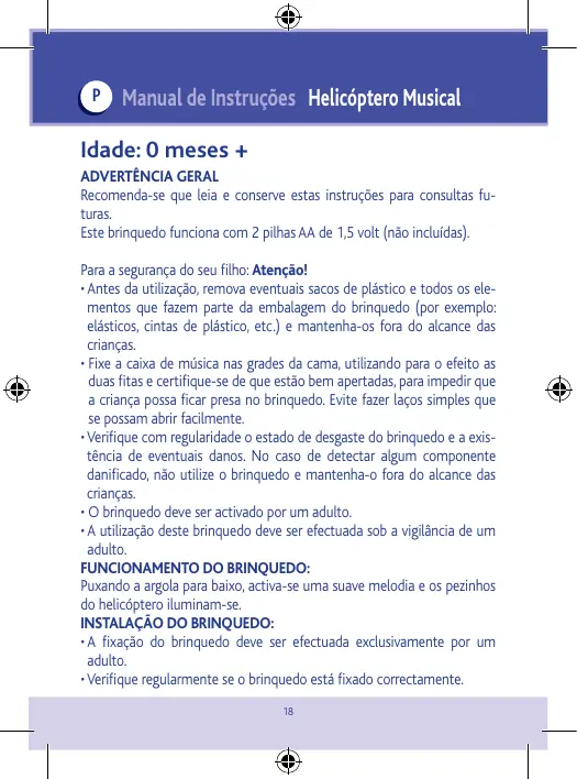 Idade: 0 meses + ADVERTÊNCIA GERAL Recomenda-se que leia e conserve estas instruções para consultas futuras. Este brinquedo funciona com 2 pilhas AA de 1,5 volt (não incluídas). Para a segurança do seu filho: Atenção! • Antes da utilização, remova eventuais sacos de plástico e todos os elementos que fazem parte da embalagem do brinquedo (por exemplo: elásticos, cintas de plástico, etc.) e mantenha-os fora do alcance das crianças. • Fixe a caixa de música nas grades da cama, utilizando para o efeito as duas fitas e certifique-se de que estão bem apertadas, para impedir que a criança possa ficar presa no brinquedo. Evite fazer laços simples que se possam abrir facilmente. • Verifique com regularidade o estado de desgaste do brinquedo e a existência de eventuais danos. No caso de detectar algum componente danificado, não utilize o brinquedo e mantenha-o fora do alcance das crianças. • O brinquedo deve ser activado por um adulto. • A utilização deste brinquedo deve ser efectuada sob a vigilância de um adulto. FUNCIONAMENTO DO BRINQUEDO: Puxando a argola para baixo, activa-se uma suave melodia e os pezinhos do helicóptero iluminam-se. INSTALAÇÃO DO BRINQUEDO: • A fixação do brinquedo deve ser efectuada exclusivamente por um adulto. • Verifique regularmente se o brinquedo está fixado correctamente. 18