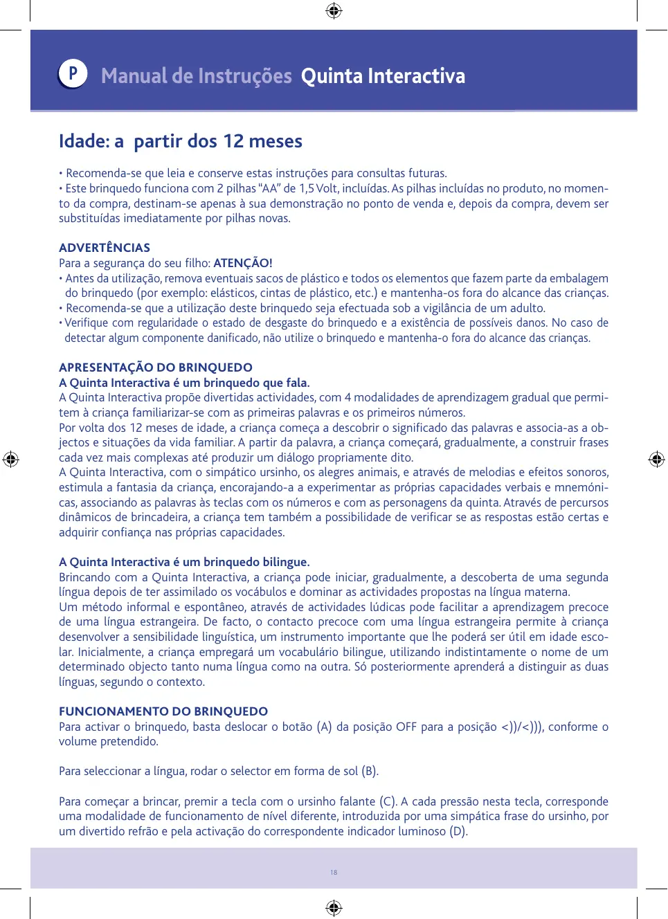 INTRODUCCIÓN AL JUGUETE Granja Sonora - un juguete que habla. La Granja Sonora propone divertidas actividades con 4 modalidades graduales de aprendizaje que permiten al bebé familiarizarse con las primeras palabras y con los primeros números. Alrededor de los 12 meses de edad, el bebé comienza efectivamente a descubrir el significado de las palabras y las asocia a objetos y situaciones de la vida familiar. A partir de las palabras individuales el bebé se va haciendo capaz de construir frases cada vez más complejas, hasta llegar al verdadero diálogo propiamente dicho. La Granja Sonora, con el simpático osito y muchos alegres animalitos, melodías y efectos sonoros, estimula la fantasía del bebé animándolo a experimentar sus propias capacidades verbales y pnemotécnicas asociando las palabras a las teclas con los números y a los personajes de la granja. A través de dinámicos recorridos de juego, el bebé tiene además la posibilidad de verificar la exactitud de las respuestas y adquirir confianza en sus propias capacidades. Granja Sonora - un juego bilingüe. Jugando con la Granja Sonora es posible introducir gradualmente al bebé al descubrimiento de un segundo idioma, una vez que se ha familiarizado con los vocablos y las actividades de juego en su lengua materna. Un acercamiento informal y espontáneo a través de la diversión del juego puede favorecer el aprendizaje precoz de un segundo idioma. En efecto, un acercamiento precoz permite al niño desarrollar una sensibilidad lingüística que podrá transformarse para él en un importante instrumento durante la fase de aprendizaje escolar. Inicialmente el bebé recurre a su vocabulario bilingüe y utiliza indistintamente el nombre del objeto tanto en un idioma como en el otro. Solo en un momento sucesivo aprenderá a distinguir los dos idiomas en base al contexto. FUNCIONAMIENTO DEL JUGUETE Para activar el juguete, es suficiente con mover el cursor (A) de la posición OFF a la posición <))/<))) según el volumen deseado. Para seleccionar el idioma, girar el selector con forma de sol (B). Para comenzar a jugar, apretar el botón con el osito hablador (C). A cada presión de este botón corresponde una modalidad de juego de nivel diferente, introducida por una simpática frase del osito, por un gracioso estribillo y por la activación del indicador luminoso correspondiente (D). 15 • La sustitución de las pilas correrá siempre por cuenta de un adulto. • Para sustituir las pilas: aflojar el tornillo de la tapa, con un destornillador, sacar la tapa, retirar las pilas agotadas e introducir las pilas nuevas teniendo cuidado de respetar la polaridad de inserción correcta (tal y como viene indicado en el producto), volver a colocar la tapa y apretar el tornillo hasta el tope. • No dejar las pilas ni otros instrumentos al alcance de los niños. • Retirar siempre las pilas agotadas del producto para evitar que eventuales pérdidas de líquido puedan dañarlo. • Retirar siempre las pilas en caso de inutilización prolongada del producto. • Emplear pilas alcalinas, iguales o equivalentes al tipo que se aconseja para hacer funcionar este producto. • No se deben mezclar tipos distintos de pilas, ni pilas descargadas con pilas nuevas. • No tirar al fuego ni al cubo de basura las pilas descargadas, sino eliminarlas depositándolas en el contenedor correspondiente. • No poner en corto circuito los bornes de alimentación. • Las pilas no recargables no se deben recargar: podrían estallar. • No se aconseja el uso de baterías recargables, podría disminuir la funcionalidad del juguete. • En caso de que se utilicen baterías recargables, extraerlas del juguete antes de recargarlas y efectuar la recarga sólo bajo la supervisión de un adulto.