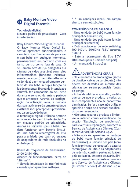 ADVERTÊNCIAS GERAIS • Os elementos da embalagem (sacos de plástico, caixas de cartão, etc.) não devem ser deixados ao alcance das crianças por serem potenciais fontes de perigo. • Antes de utilizar o aparelho, certifique-se de que o produto e todos os seus componentes não se encontram danificados. Se for o caso, não utilize o aparelho e dirija-se a pessoal qualificado ou ao revendedor. • Não tente reparar o produto e limite-se a intervir como especificado na secção “Resolução de problemas”. Para eventuais reparações, contacte o Serviço de Assistência a Clientes (Customer Service) da Artsana S.p.A. • Não abra os aparelhos. A unidade do bebé (com função principal de transmissor), a unidade dos pais (com função principal de receptor), a bateria recarregável de lítio e os adaptadores de rede não contêm partes utilizáveis pelo utilizador. Em caso de avaria, dirija-se a pessoal competente ou contacte o Serviço de Assistência a Clientes (Customer Service) da Artsana S.p.A.