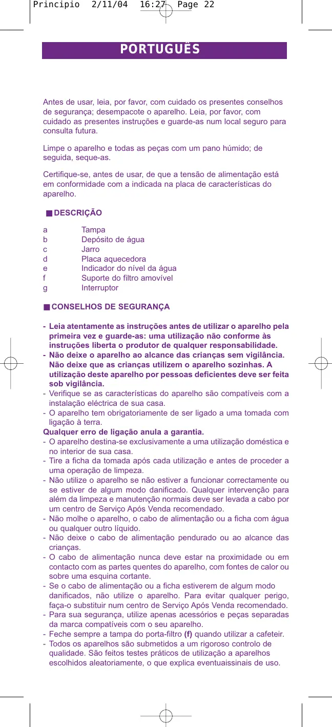 - Vérifiez que la tension d’alimentation de l’appareil correspond bien à celle de votre installation électrique. - Cet appareil doit être branché sur une prise de courant avec terre. Toute erreur de branchement annule la garantie. - L’appareil est destiné uniquement à un usage domestique et à l’intérieur de la maison. - Débranchez l’appareil dès que vous cessez de l’utiliser et lorsque vous le nettoyez. - N’utilisez pas l’appareil s’il ne fonctionne pas correctement ou s’il a été endommagé. Toute intervention autre que le nettoyage et l’entretien usuel par le client doit être effectuée par un centre service agréé (voir liste dans le livret service). - Ne mettez pas l’appareil, le câble d’alimentation ou la fiche dans l’eau ou tout autre liquide. - Ne laissez pas pendre le câble d’alimentation à portée de mains des enfants. - Le câble d’alimentation ne doit jamais être à proximité ou en contact avec les parties chaudes de votre appareil, près d’une source de chaleur ou sur angle vif. - Si le câble d’alimentation ou la fiche sont endommagés, n’utilisez pas l’appareil. Afin d’éviter tout danger, faites-les obligatoirement remplacer par un centre service agréé (voir liste dans le livret service). - Pour votre sécurité, n’utilisez que des accessoires et des pièces détachées adaptés à votre appareil. - Fermez toujours le couvercle du porte-filtre (f) lors de l’utilisation de la cafetière. - Tous les appareils sont soumis à un contrôle qualité sévère. Des essais d’utilisation pratiques sont faits avec des appareils pris au hasard, ce qui explique d’éventuelles traces d’utilisation.