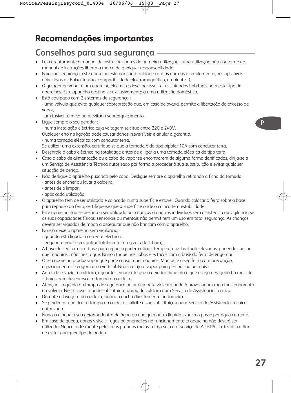 NoticePressingEasycord_ 014004 26/06/06 & Page 27 Recomendaçôes importantes Conselhos para sua segurança + Leia atentamente o manual de instruçées antes da primeira utilizaçäo : uma utilizaçäo nâo conforme ao manual de instruçôes liberta a marca de qualquer responsabilidade. + Para sua segurança, este aparelho estä em conformidade com as normas e regulamentacôes aplicveis (Directivas de Baixa Tensäo, compatibilidade electromagnética, ambiente...) + O gerador de vapor é um aparelho eléctrico : deve, por isso, ter os cuidados habituais para este tipo de aparelhos. Este aparelho destina-se exclusivamente a uma utilizaçäo doméstica: +. Esté equipado com 2 sistemas de segurança - uma vélvula que evita qualquer sobrepressäo que, em caso de avaria, permite a libertaçäo do excesso de vapor, - um fusivel térmico para evitar o sobreaquecimento. 2 _ Ligue sempre 0 seu gerador Ce | - numa instalaçäo eléctrica cuja voltagem se situe entre 220 e 240V. Qualquer erro na ligaçäo pode causar danos irreversiveis e anular a garantia. - numa tomada eléctrica com condutor terra. Se utilizar uma extensäo, certifique-se que a tomada é do tipo bipolar 10A com condutor terra. +. Desenrole o cabo eléctrico na totalidade antes de o ligar a uma tomada eléctrica de tipo terra. +. Caso o cabo de alimentaçäo ou o cabo do vapor se encontrarem de alguma forma danificados, dirija-se a um Serviço de Assisténcia Técnica autorizado por forma a proceder à sua substituiçäo e evitar qualquer situaçäo de perigo. + Näo desligue o aparelho puxando pelo cabo. Desligue sempre o aparelho retirando a ficha da tomada - antes de encher ou lavar a caldeira, - antes de o limpar, - apés cada utilizaçäo. + O aparelho tem de ser utilizado e colocado numa superficie estävel. Quando colocar o ferro sobre a base para repouso do ferro, certifique-se que a superficie onde o coloca tem estabilidade. + Este aparelho näo se destina a ser utilizado por crianças ou outros individuos sem assisténcia ou vigiläncia se as suas capacidades fisicas, sensoriais ou mentais näo permitirem um uso em total segurança. As crianças devem ser vigiadas de modo a assegurar que no brincam com o aparelho + Nunca deixe o aparelho sem vigiläncia - quando està ligado à corrente eléctrica. - enquanto nâo se encontrar totalmente frio (cerca de 1 hora). + A base do seu ferro e a base para repouso podem atingir temperaturas bastante elevadas, podendo causar queimaduras : näo Ihes toque. Nunca toque nos cabos eléctricos com a base do ferro de engomar. + O seu aparelho produz vapor que pode causar queimaduras. Manipule o seu ferro com precaucäo, especialmente se engomar na vertical. Nunca dirija o vapor para pessoas ou animals. + Antes de esvaziar a caldeira, aguarde sempre até que o gerador fique frio e que esteja desligado hä mais de 2 horas para desenroscar a tampa da caldeira. + Atençäo : a queda da tampa de segurança ou um embate violento poderä provocar um mau funcionamento da välvula. Nesse caso, mande substituir a tampa da caldeira num Serviço de Assisténcia Técnica. + Durante a lavagem da caldeira, nunca a encha directamente na torneira. + Se perder ou danificar a tampa da caldeira, solicite a sua substituiçäo num Serviço de Assisténcia Técnica autorizado. + Nunca coloque o seu gerador dentro de ägua ou qualquer outro liquido. Nunca o passe por âgua corrente. + Em caso de queda, danos visiveis, fugas ou anomalias no funcionamento, o aparelho nâo deverä ser utilizado. Nunca o desmonte pelos seus préprios meios : dirija-se a um Serviço de Assisténcia Técnica a fim de evitar qualquer tipo de perigo.