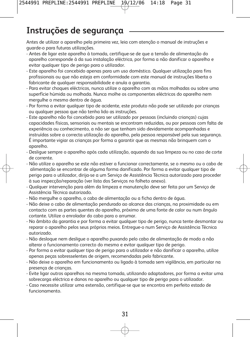 - Cet appareil est destiné uniquement à un usage domestique. Son utilisation prolongée à des fins commerciales et professionnelles risque de surcharger l'appareil et d'endommager celui-ci ou de provoquer des blessures corporelles. Une utilisation dans de telles conditions annule la garantie de l'appareil. - Pour éviter les chocs électriques, n'utilisez jamais l'appareil avec les mains mouillées ou sur une surface humide ou mouillée. Evitez de mouiller les composants électriques de l'appareil et ne les plongez jamais dans l'eau. - Pour éviter les accidents, ce produit ne doit pas être utilisé par un enfant ou par toute personne n'ayant pas lu les instructions. - Cet appareil n'est pas prévu pour être utilisé par des personnes ( y compris les enfants ) dont les capacités physiques, sensorielles ou mentales sont réduites, ou des personnes dénuées d'expérience ou de connaissance, sauf si elles ont pu bénéficier, par l'intermédiaire d'une personne responsable de leur sécurité, d'une surveillance ou d'instructions préalables concernant l'utilisation de l'appareil. - Il convient de surveiller les enfants pour s'assurer qu'ils ne jouent pas avec l'appareil. - Débranchez toujours l’appareil dès que vous cessez de l’utiliser, lorsque vous le nettoyez ou en cas de coupure de courant. - N’utilisez pas votre appareil s’il ne fonctionne pas correctement, s’il a été endommagé ou si le câble d’alimentation ou la fiche sont endommagés. Afin d’éviter tout danger,faites-les obligatoirement remplacer par un centre de service agréé (voir liste dans le livret service). - Toute intervention autre que le nettoyage et l’entretien usuel par le client doit être effectuée par un centre de service agréé.- Ne mettez pas l’appareil, le câble d’alimentation ou la fiche dans du liquide. - Ne laissez pas le câble d’alimentation pendre à portée de mains des enfants, être à proximité ou en contact avec les parties chaudes de l’appareil, près d’une source de chaleur ou sur un angle vif. Utilisez l’enrouleur de cordon pour le ranger. - Pour conserver la garantie de l'appareil et éviter tout problème technique, n'essayez jamais de démonter ou de réparer vous-même l'appareil et ne laissez aucune personne non qualifiée le faire. Portez l'appareil dans un service après-vente agréé. - Ne déplacez ni ne débranchez jamais l'appareil en tirant sur le cordon d'alimentation pour ne pas altérer le bon fonctionnement de l'appareil et éviter tout risque d'accident. - L'utilisation d'éléments et d'accessoires non recommandés par le fabricant peut provoquer des blessures corporelles, endommager l'appareil, entraîner son mauvais fonctionnement et annuler sa garantie, - Pour éviter les chocs électriques, assurez-vous que vos doigts n'entrent pas en contact avec les broches de la prise lorsque vous branchez ou débranchez l'appareil. - Ne laissez pas l'appareil en fonctionnement ou branché sur sa prise lorsque vous vous éloignez, même pour quelques instants, surtout en présence d'enfants. - Ne branchez pas d'autres appareils sur la même prise secteur en utilisant des adaptateurs, afin d'éviter toute surcharge électrique susceptible d'endommager l'appareil ou de provoquer des accidents. N’utilisez un prolongateur qu’après avoir vérifié que celui-ci est en bon état.