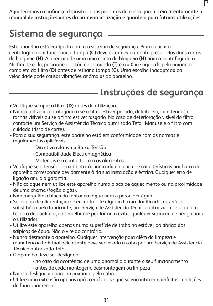 - Nunca desmonte o aparecido. Qualquer intervenção para eles da limpeza e manutençao habitual pelo cliente deve ser levada a cabo por um Servico de Assistencia Técnica autorizada Tefal.