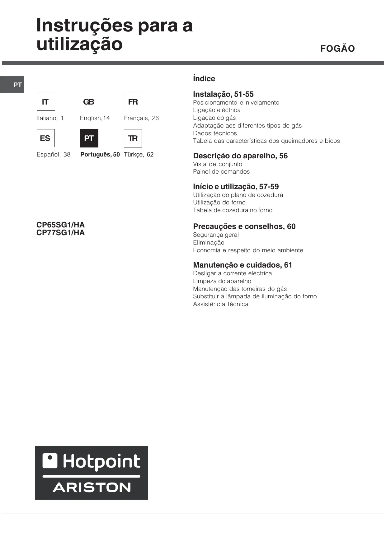 Português, 50 Türkçe, 62 Instalação, 51-55 Posicionamento e nivelamento Ligação eléctrica Ligação do gás Adaptação aos diferentes tipos de gás Dados técnicos Tabela das características dos queimadores e bicos Descrição do aparelho, 56 Vista de conjunto Painel de comandos Início e utilização, 57-59 Utilização do plano de cozedura Utilização do forno Tabela de cozedura no forno CP65SG1/HA CP77SG1/HA Precauções e conselhos, 60 Segurança geral Eliminação Economia e respeito do meio ambiente Manutenção e cuidados, 61 Desligar a corrente eléctrica Limpeza do aparelho Manutenção das torneiras do gás Substituir a lâmpada de iluminação do forno Assistência técnica Instalação É importante guardar este folheto para poder consultá-lo a qualquer momento. No caso de venda, cessão ou mudança, assegure-se que o mesmo permaneça com o aparelho. Após um uso prolongado do aparelho é aconselhável abrir uma janela ou aumentar a velocidade dos eventuais ventiladores.