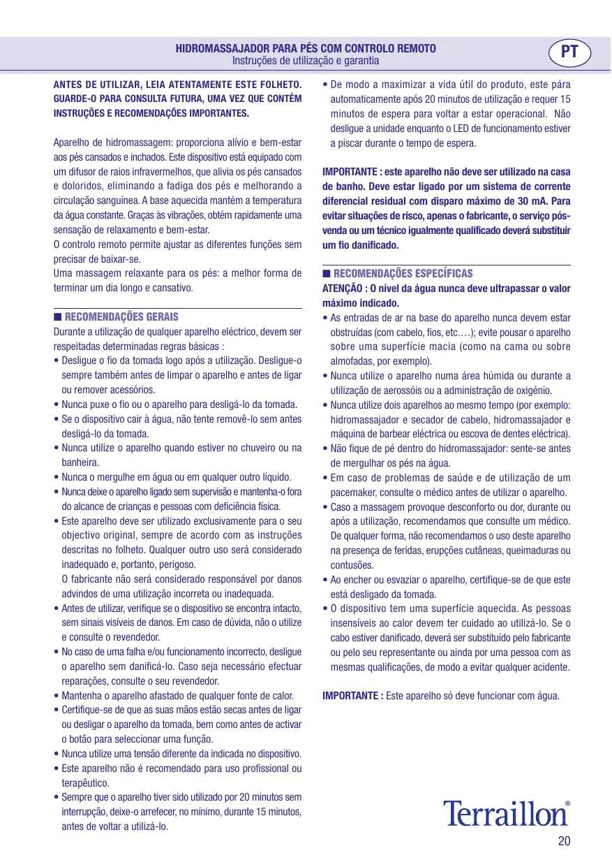 • Cet appareil n’est pas recommandé pour des utilisations à des fins professionnelles ou curatives. • Après avoir utilisé l’appareil sans interruption pendant une durée de 20 minutes, il est nécessaire de le laisser refroidir pendant au moins 15 minutes. • Pour optimiser la durée de vie du produit, l’alimentation s’arrête automatiquement après 20 minutes d’utilisation et ne se remet en marche qu’après 15 minutes d’attente. Ne débranchez pas l’appareil lorsque la diode d’alimentation clignote durant cette période d’attente. IMPORTANT : Cet appareil ne doit pas être utilisé dans une salle d’eau. L’appareil devrait être alimenté par l’intermédiaire d’un dispositif à courant différentiel résiduel ayant un courant de déclenchement n’excédant pas 30 mA. Si le câble est endommagé, il doit être remplacé par le fabricant, son service après-vente ou des personnes de qualifications similaires afin d’éviter le danger. ■ CONSEILS PARTICULIERS ATTENTION : La quantité d’eau ne doit jamais dépasser le niveau maximum indiqué. • Faites attention que les entrées d’air sur le fond de l’appareil ne soient jamais bouchées (comme par exemple : des cheveux, des fils,…) ; éviter de poser l’appareil sur des superficies molles (comme par exemple: lit ou coussins ). • Ne pas utiliser l’appareil dans des endroits humides ou durant l’utilisation d’aérosols ou administration d’oxygène. • N’utiliser en aucun cas deux appareils en même temps (par exemple : hydromassage plantaire et sèche-cheveux, hydromassage plantaire et rasoir électrique ou brosse à dents électrique). • Ne pas se mettre debout dans l’hydromasseur : s’asseoir avant de mettre les pieds dans l’eau. • En cas de problèmes de santé et pour les personnes munis de pacemaker, il est recommandé de consulter son médecin avant toute utilisation de l’appareil. • Dans le cas où le massage est désagréable ou s’il provoque des douleurs aussi bien durant qu’après le traitement, il est conseillé de consulter son médecin. Dans tous les cas, il est recommandé de ne pas utiliser l’appareil en présence de blessures, éruptions cutanées, brûlures ou contusions. • Durant les opérations de remplissage et de vidange, la prise doit toujours être débranchée de la prise de courant. IMPORTANT : Cet appareil ne doit fonctionner qu’avec de l’eau.