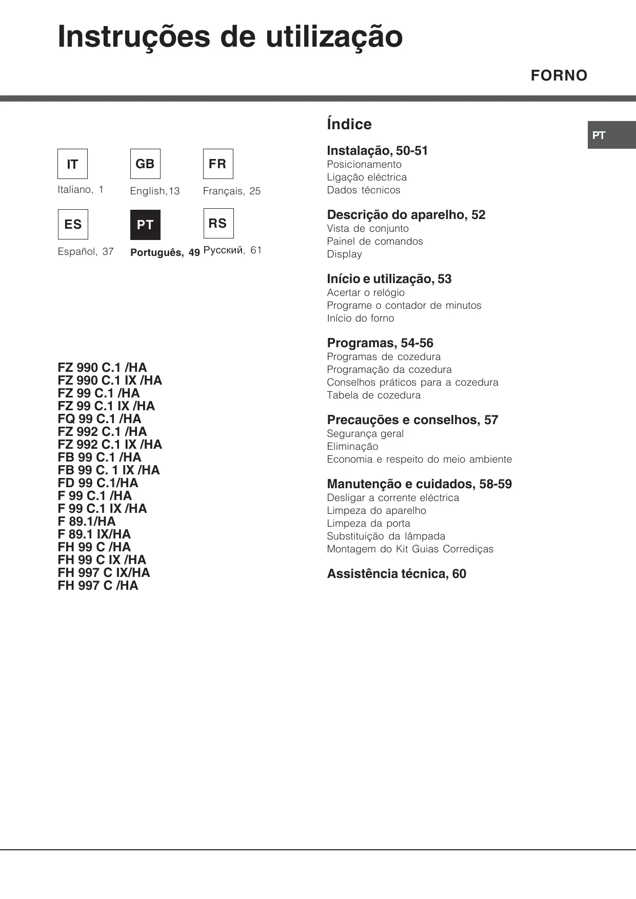 Encontre gratuitamente o manual do aparelho FH 997 C IX/HA HOTPOINT em formato PDF.