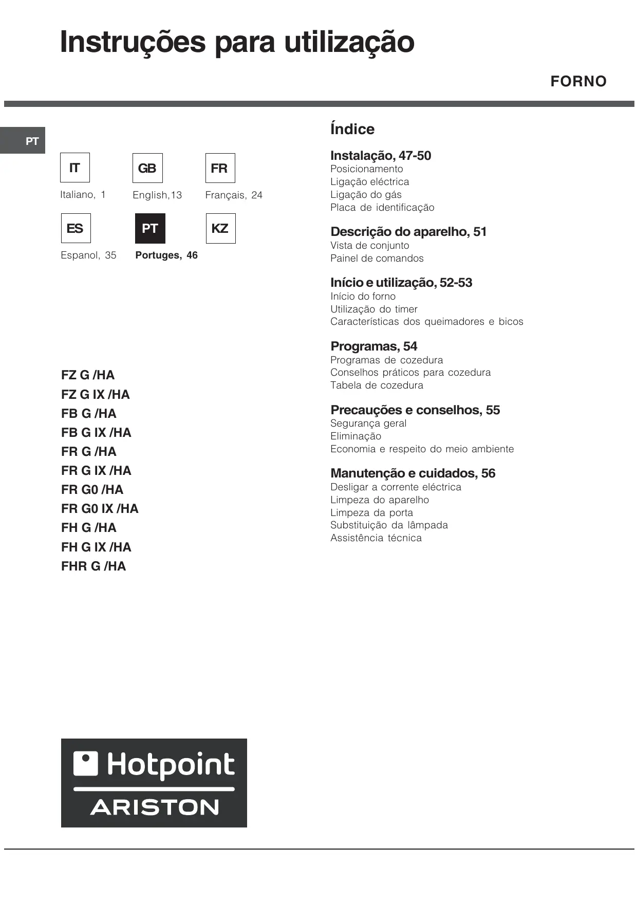 MANUAL DE UTILIZADOR FH G IX/HA HOTPOINT