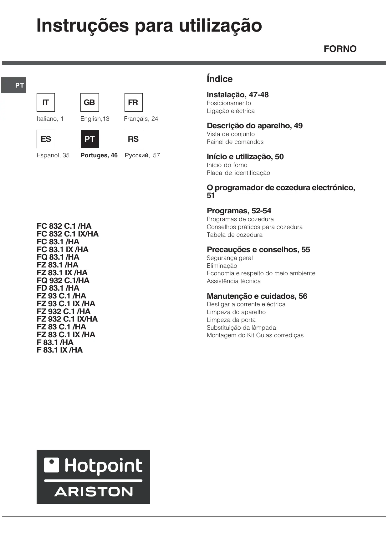 Ðóññêèé, 57 Instalação, 47-48 Posicionamento Ligação eléctrica Descrição do aparelho, 49 Vista de conjunto Painel de comandos Início e utilização, 50 Início do forno Placa de identificação O programador de cozedura electrónico, Programas, 52-54 FC 832 C.1 /HA FC 832 C.1 IX/HA FC 83.1 /HA FC 83.1 IX /HA FQ 83.1 /HA FZ 83.1 /HA FZ 83.1 IX /HA FQ 932 C.1/HA FD 83.1 /HA FZ 93 C.1 /HA FZ 93 C.1 IX /HA FZ 932 C.1 /HA FZ 932 C.1 IX/HA FZ 83 C.1 /HA FZ 83 C.1 IX /HA F 83.1 /HA F 83.1 IX /HA Programas de cozedura Conselhos práticos para cozedura Tabela de cozedura Precauções e conselhos, 55 Segurança geral Eliminação Economia e respeito do meio ambiente Assistência técnica Manutenção e cuidados, 56 Desligar a corrente eléctrica Limpeza do aparelho Limpeza da porta Substituição da lâmpada Montagem do Kit Guias corrediças Instalação ! É importante guardar este folheto para poder consultá-lo a qualquer momento. No caso de venda, cessão ou mudança, assegure-se que o mesmo permanece com o aparelho para informar o novo proprietário sobre o funcionamento e sobre as respectivas advertências. ! Leia com atenção as instruções: nas quais há informações importantes sobre a instalação, a utilização e a segurança. Posicionamento Ventilação