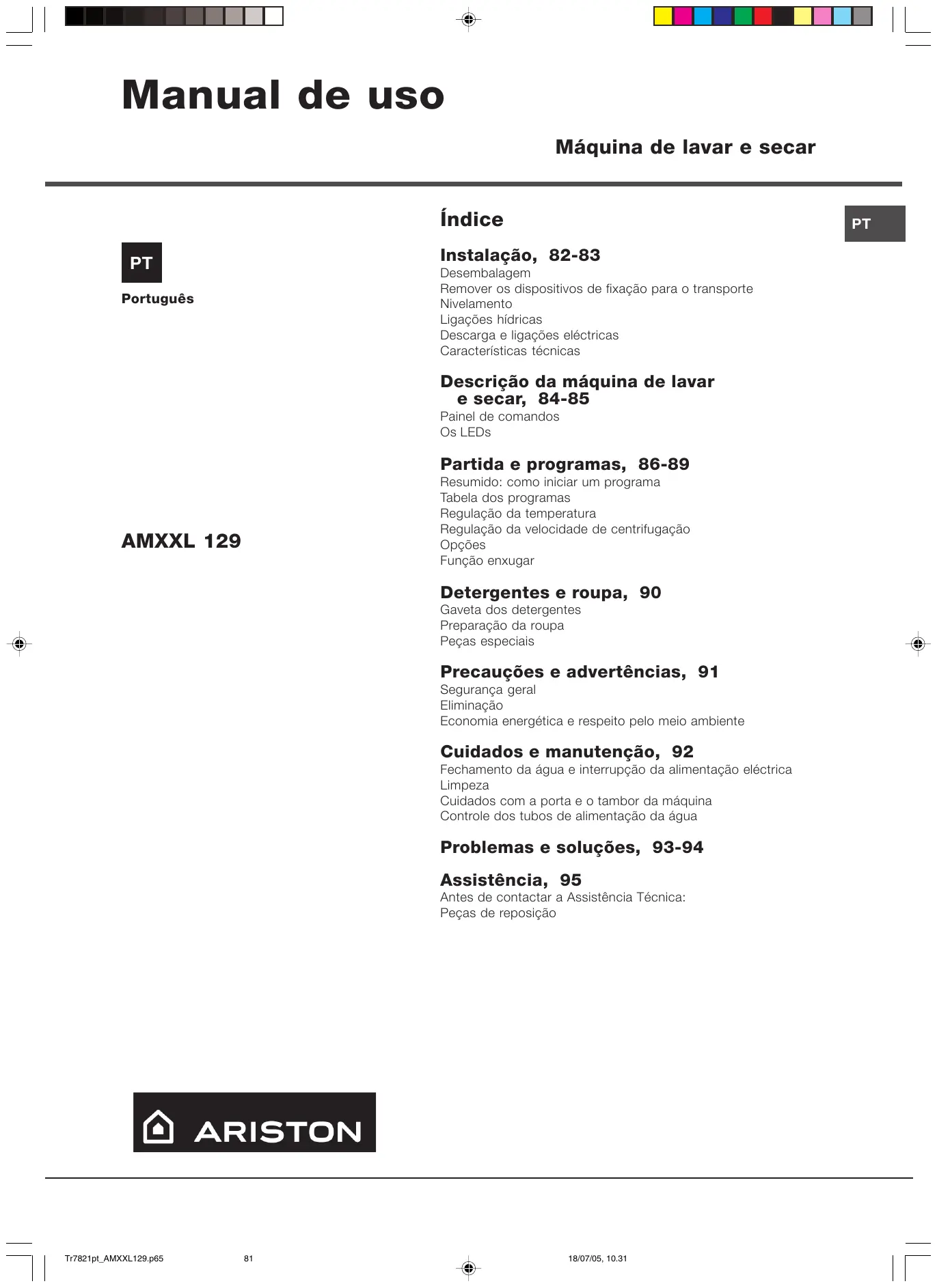 Desembalagem Remover os dispositivos de fixação para o transporte Nivelamento Ligações hídricas Descarga e ligações eléctricas Características técnicas Português Descrição da máquina de lavar e secar, 84-85 Painel de comandos Os LEDs Partida e programas, 86-89 Resumido: como iniciar um programa Tabela dos programas Regulação da temperatura Regulação da velocidade de centrifugação Opções Função enxugar AMXXL 129 Detergentes e roupa, 90 Gaveta dos detergentes Preparação da roupa Peças especiais Precauções e advertências, 91 Segurança geral Eliminação Economia energética e respeito pelo meio ambiente Cuidados e manutenção, 92 Fechamento da água e interrupção da alimentação eléctrica Limpeza Cuidados com a porta e o tambor da máquina Controle dos tubos de alimentação da água Problemas e soluções, 93-94 Assistência, 95 Antes de contactar a Assistência Técnica: Peças de reposição Tr7821pt_AMXXL129.p65