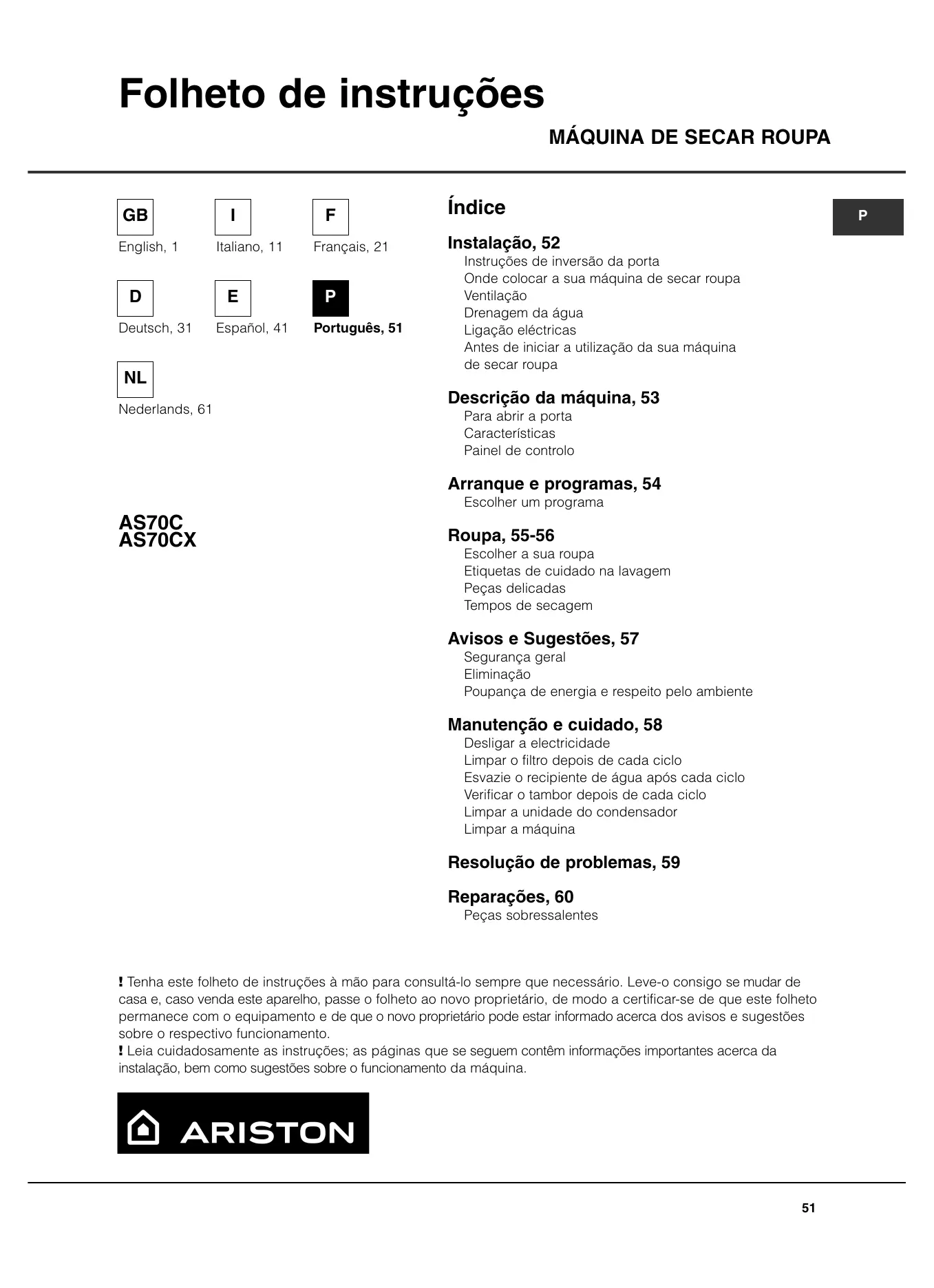 Instalação, 52 Instruções de inversão da porta Onde colocar a sua máquina de secar roupa Ventilação Drenagem da água Ligação eléctricas Antes de iniciar a utilização da sua máquina de secar roupa Descrição da máquina, 53 Para abrir a porta Características Painel de controlo Arranque e programas, 54 Escolher um programa AS70C AS70CX Roupa, 55-56 Escolher a sua roupa Etiquetas de cuidado na lavagem Peças delicadas Tempos de secagem Avisos e Sugestões, 57 Segurança geral Eliminação Poupança de energia e respeito pelo ambiente Manutenção e cuidado, 58 Desligar a electricidade Limpar o filtro depois de cada ciclo Esvazie o recipiente de água após cada ciclo Verificar o tambor depois de cada ciclo Limpar a unidade do condensador Limpar a máquina Resolução de problemas, 59 Reparações, 60 Peças sobressalentes ! Tenha este folheto de instruções à mão para consultá-lo sempre que necessário. Leve-o consigo se mudar de casa e, caso venda este aparelho, passe o folheto ao novo proprietário, de modo a certificar-se de que este folheto permanece com o equipamento e de que o novo proprietário pode estar informado acerca dos avisos e sugestões sobre o respectivo funcionamento. ! Leia cuidadosamente as instruções; as páginas que se seguem contêm informações importantes acerca da instalação, bem como sugestões sobre o funcionamento da máquina.
