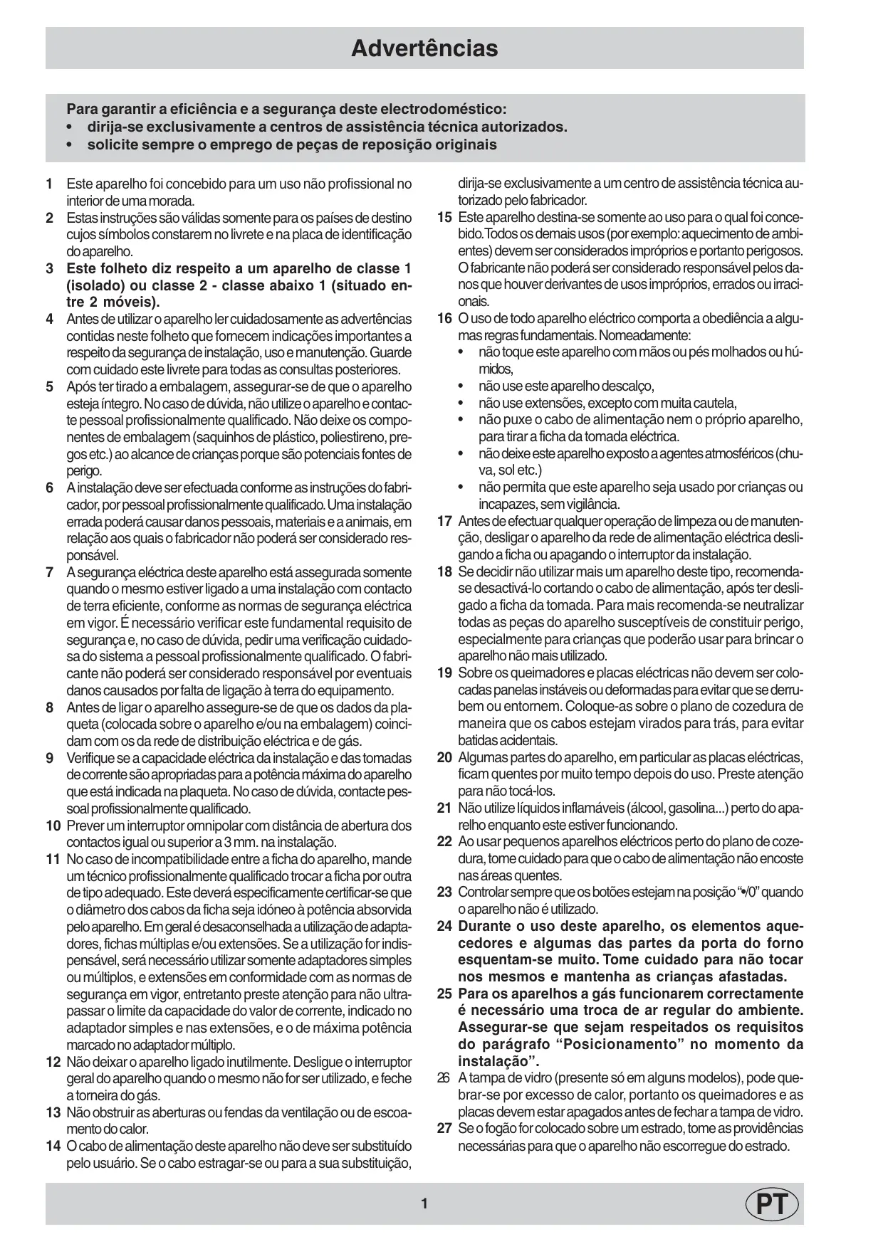 quando o mesmo estiver ligado a umainstalaçäo com contacto de terra eficiente, conforme as normas de segurança eléctrica em vigor. É necessärio verificar este fundamental requisito de segurança e, no caso de düvida, pedir uma verificaçäo cuidado- sa do sistema a pessoal profissionalmente qualificado. O fabri- cante näo poderé ser considerado responsävel por eventuais danos causados por falta de ligaçäo à terra do equipamento. 8 Antesdeligar o aparelho assegure-se de que os dados da pla- queta (colocada sobre o aparelho e/ou na embalagem) coinci- dam com os da rede de distribuiçäo eléctrica e de gés. 9 Verifique se acapacidade eléctrica da instalaçäo e das tomadas de corrente säo apropriadas para a potência mäxima do aparelho que esté indicada na plaqueta. No caso de düvida, contacte pes- soal profissionalmente qualificado. 10 Preveruminterruptor omnipolar com distância de abertura dos contactos igual ou superior a 8 mm. nainstalaçäo. 11 Nocaso de incompatibilidade entre a ficha do aparelho, mande um técnico profissionalmente qualificado trocar a ficha por outra de tipo adequado. Este deveré especificamente certificar-se que odiâmetro dos cabos da ficha seja idéneo à poténcia absorvida pelo aparelho. Em geralé desaconselhada a utlizaçäo de adapta- dores, fichas mültiplas e/ou extensôes. Se auïilizaçäo for indis- pensävel, serâ necessärio utilizar somente adaptadores simples ou mültiplos, e extensôes em conformidade com as normas de segurança em vigor, entretanto preste atençäo para näo ultra- passar o limite da capacidade do valor de corrente, indicado no adaptador simples e nas extensôes, e o de méxima potência marcado no adaptador müliplo. 12 Näodeixar o aparelholigado inutilmente. Desligue o interruptor geral do aparelho quando o mesmo näo for ser utilizado, e feche atorneira do gés. 13 Näo obstruir as aberturas ou fendas da ventilaçäo ou de escoa- mento do calor. 14 Ocabo de alimentaçäo deste aparelho näo deve ser substituido pelo usuärio. Se o cabo estragar-se ou para a sua substituiçäo, ja-se exclusivamente a centros de assistência téc + __solicite sempre o emprego de peças de reposiçäo origi a autorizados.
