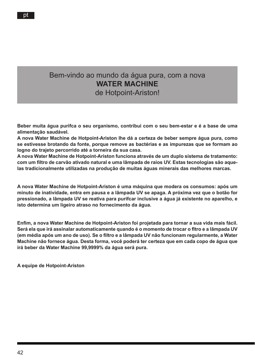 Bem-vindo ao mundo da água pura, com a nova WATER MACHINE de Hotpoint-Ariston! Beber muita água purifca o seu organismo, contribui com o seu bem-estar e é a base de uma alimentação saudável. A nova Water Machine de Hotpoint-Ariston lhe dá a certeza de beber sempre água pura, como se estivesse brotando da fonte, porque remove as bactérias e as impurezas que se formam ao logno do trajeto percorrido até a torneira da sua casa. A nova Water Machine de Hotpoint-Ariston funciona através de um duplo sistema de tratamento: com um filtro de carvão ativado natural e uma lâmpada de raios UV. Estas tecnologias são aquelas tradicionalmente utilizadas na produção de muitas águas minerais das melhores marcas. A nova Water Machine de Hotpoint-Ariston é uma máquina que modera os consumos: após um minuto de inatividade, entra em pausa e a lâmpada UV se apaga. A próxima vez que o botão for pressionado, a lâmpada UV se reativa para purifcar inclusive a água já existente no aparelho, e isto determina um ligeiro atraso no fornecimento da água. Enfim, a nova Water Machine de Hotpoint-Ariston foi projetada para tornar a sua vida mais fácil. Será ela que irá assinalar automaticamente quando é o momento de trocar o fltro e a lâmpada UV (em média após um ano de uso). Se o filtro e a lâmpada UV não funcionam regularmente, a Water Machine não fornece água. Desta forma, você poderá ter certeza que em cada copo de água que irá beber da Water Machine 99,9999% da água será pura. A equipe de Hotpoint-Ariston