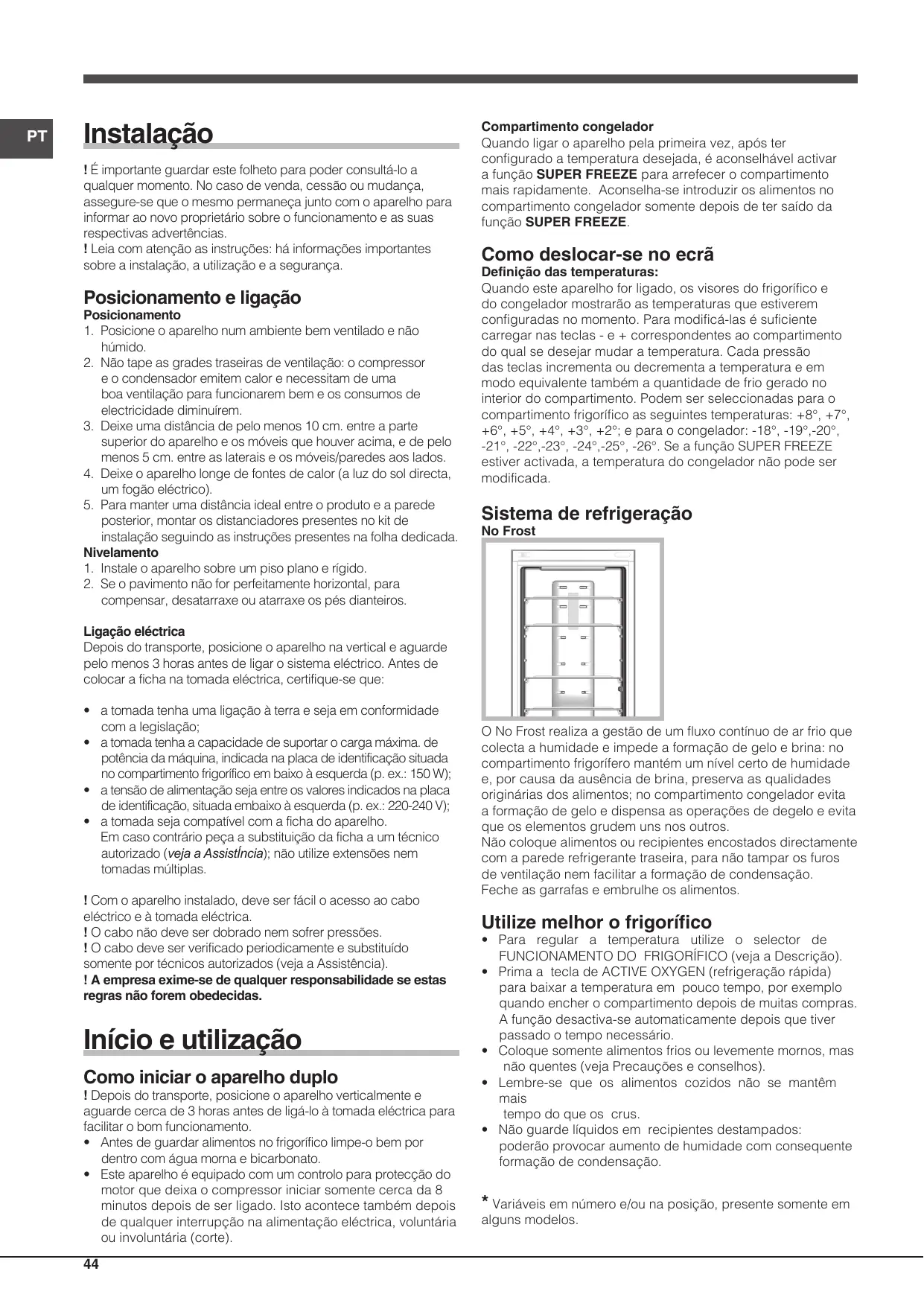 ! Se durante muito tempo, a temperatura ambiente permanecer inferior a 14^ C, não se chegará plenamente às temperatas necessarias para uma longa conservação no compartmento congélador e, portanto, o periodo de conservação sera reduzido. !Durante a congelação eviteAbrir a porta.