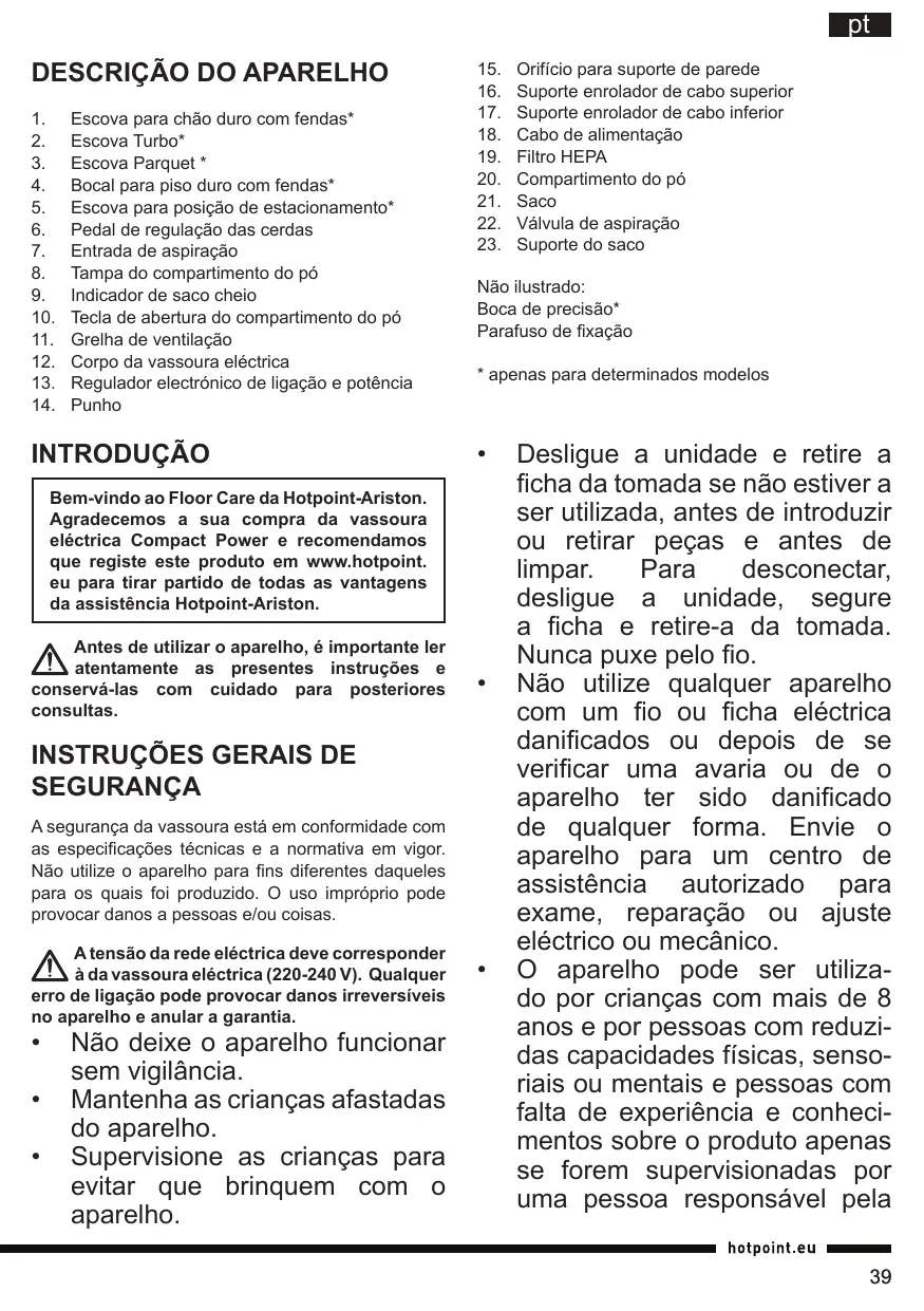 Bem-vindo ao Floor Care da Hotpoint-Ariston. Agradecemos a sua compra da vassoura electrica Compact Power e recomendamos que registre este produit em www.hotpoint. eu para tirar parte de todas asvantagens da assistencia Hotpoint-Ariston.