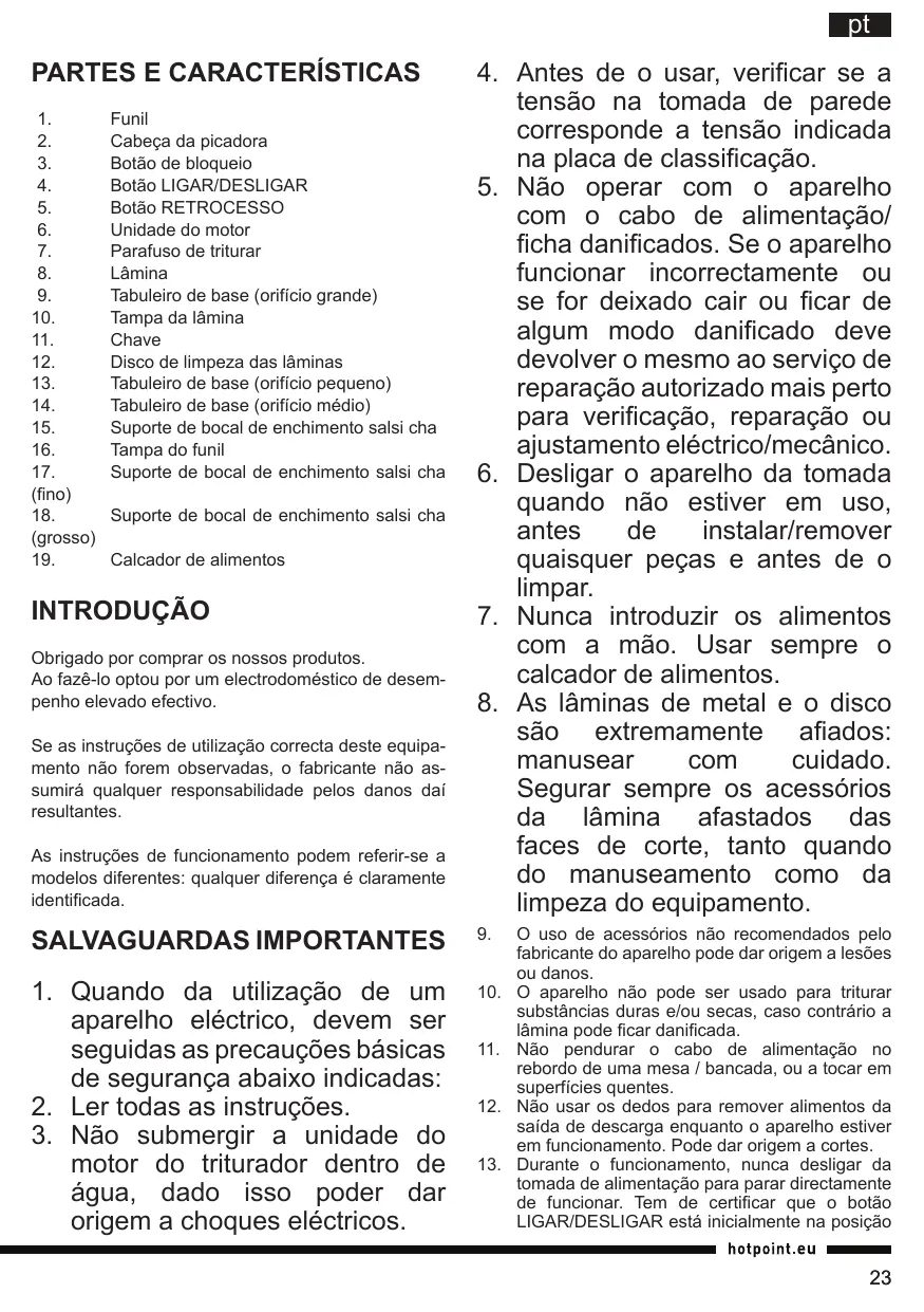 Funil Cabeça da picadora Botão de bloqueio Botão LIGAR/DESLIGAR Botão RETROCESSO Unidade do motor Parafuso de triturar Lâmina Tabuleiro de base (orifício grande) Tampa da lâmina Chave Disco de limpeza das lâminas Tabuleiro de base (orifício pequeno) Tabuleiro de base (orifício médio) Suporte de bocal de enchimento salsi cha Tampa do funil Suporte de bocal de enchimento salsi cha Suporte de bocal de enchimento salsi cha Calcador de alimentos INTRODUÇÃO Obrigado por comprar os nossos produtos. Ao fazê-lo optou por um electrodoméstico de desempenho elevado efectivo. Se as instruções de utilização correcta deste equipamento não forem observadas, o fabricante não assumirá qualquer responsabilidade pelos danos daí resultantes. As instruções de funcionamento podem referir-se a modelos diferentes: qualquer diferença é claramente identificada.