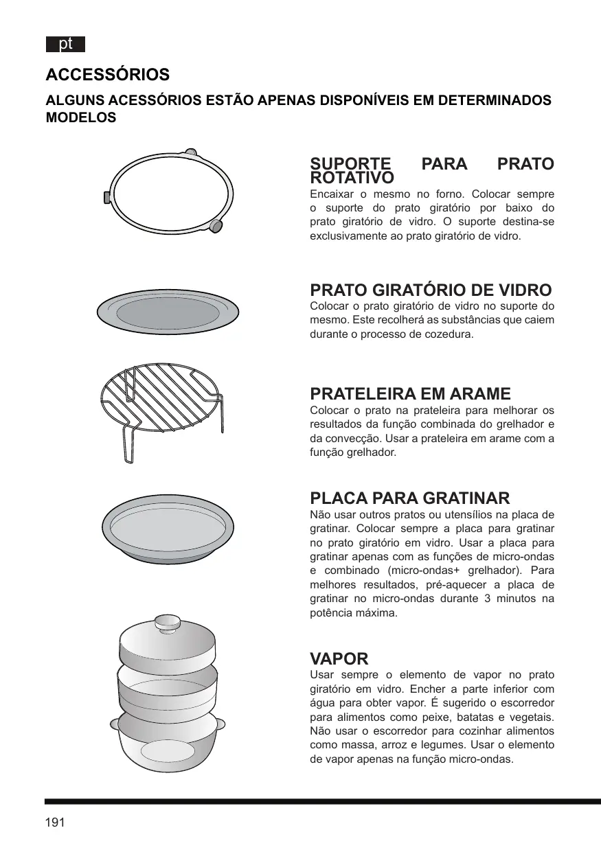 Retire o forno e todos os materiais da caixa e da cavidade do forno. O forno é fornecido com os seguintes acessórios.