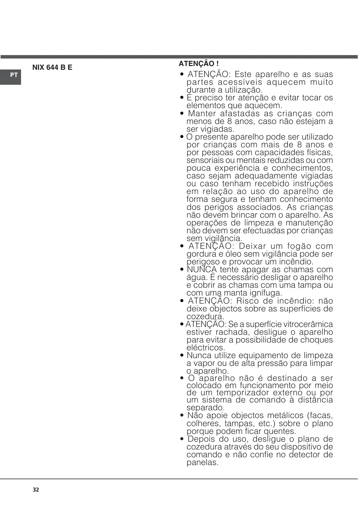 - ATENÇÃO: Risco de incêndio: não deixe objectos sobre as superfícies de cozedura.