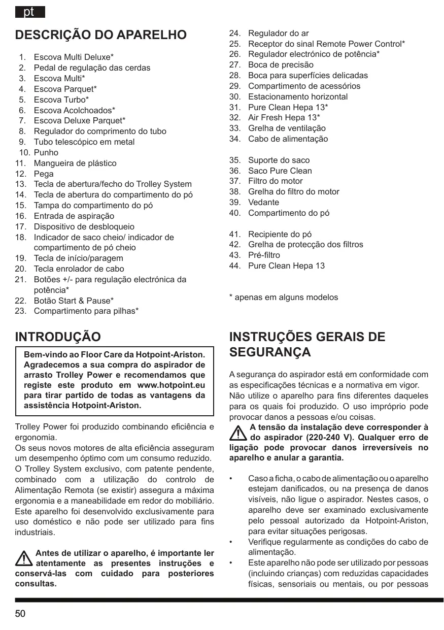 INTRODUÇÀÂO Bem-vindo ao Floor Care da Hotpoint-Ariston. Agradecemos a sua compra do aspirador de arrasto Trolley Power e recomendamos que registe este produto em www.hotpoint.eu para tirar partido de todas as vantagens da assisténcia Hotpoint-Ariston. Trolley Power foi produzido combinando eficiëncia e ergonomia. Os seus novos motores de alta eficiència asseguram um desempenho éptimo com um consumo reduzido. O Trolley System exclusivo, com patente pendente, combinado com a utiizaçäo do controlo de Alimentaçäo Remota (se existir) assegura a mäxima ergonomia e a maneabilidade em redor do mobiliärio. Este aparelho foi desenvolvido exclusivamente para uso doméstico e näo pode ser utilizado para fins industriais. Antes de utilizar o aparelho, é importante ler atentamente as presentes instruçôes e conservä-las com cuidado para posteriores consultas.