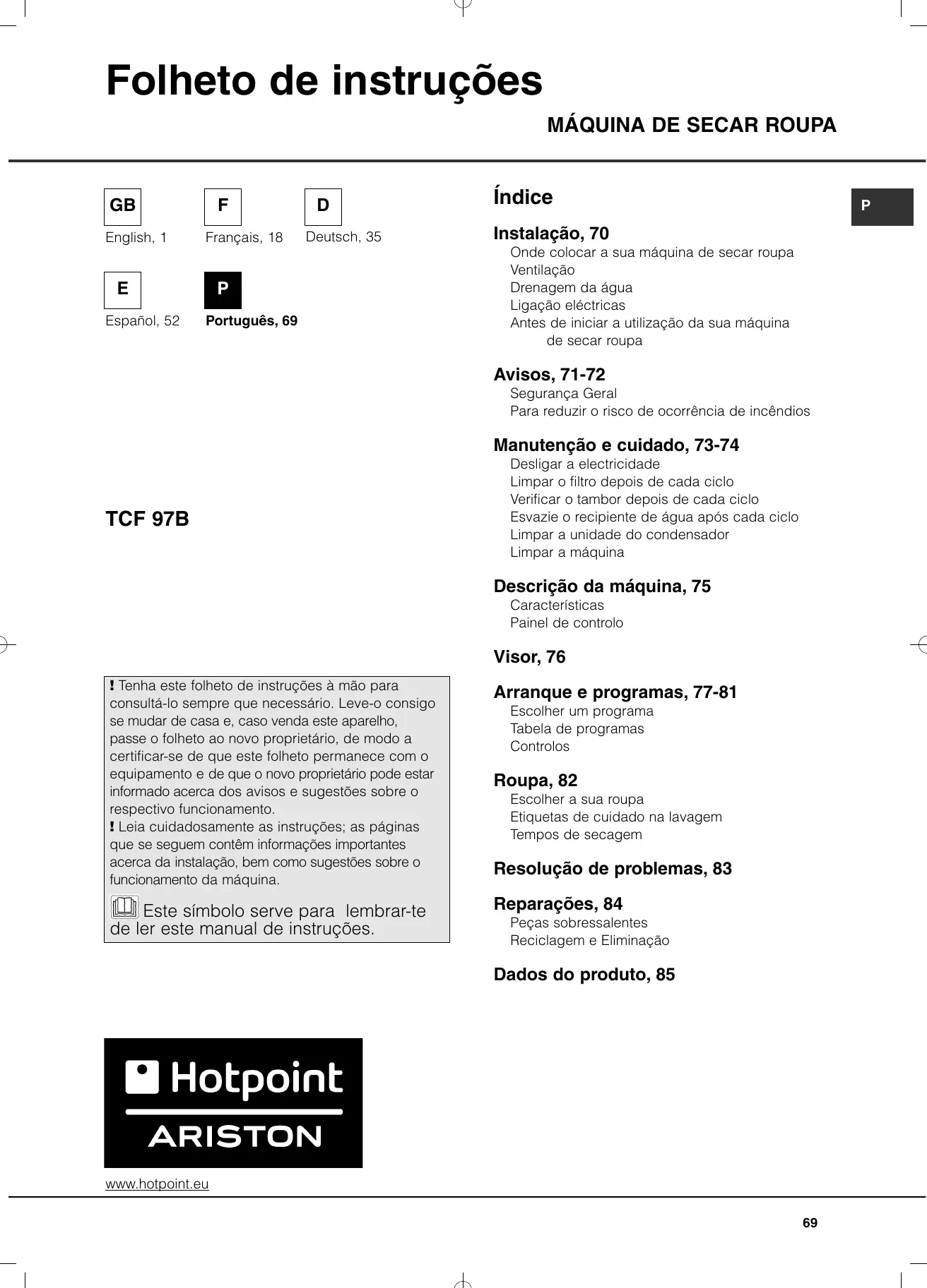 MANUAL DE UTILIZADOR TCF 97B 6HY HOTPOINT