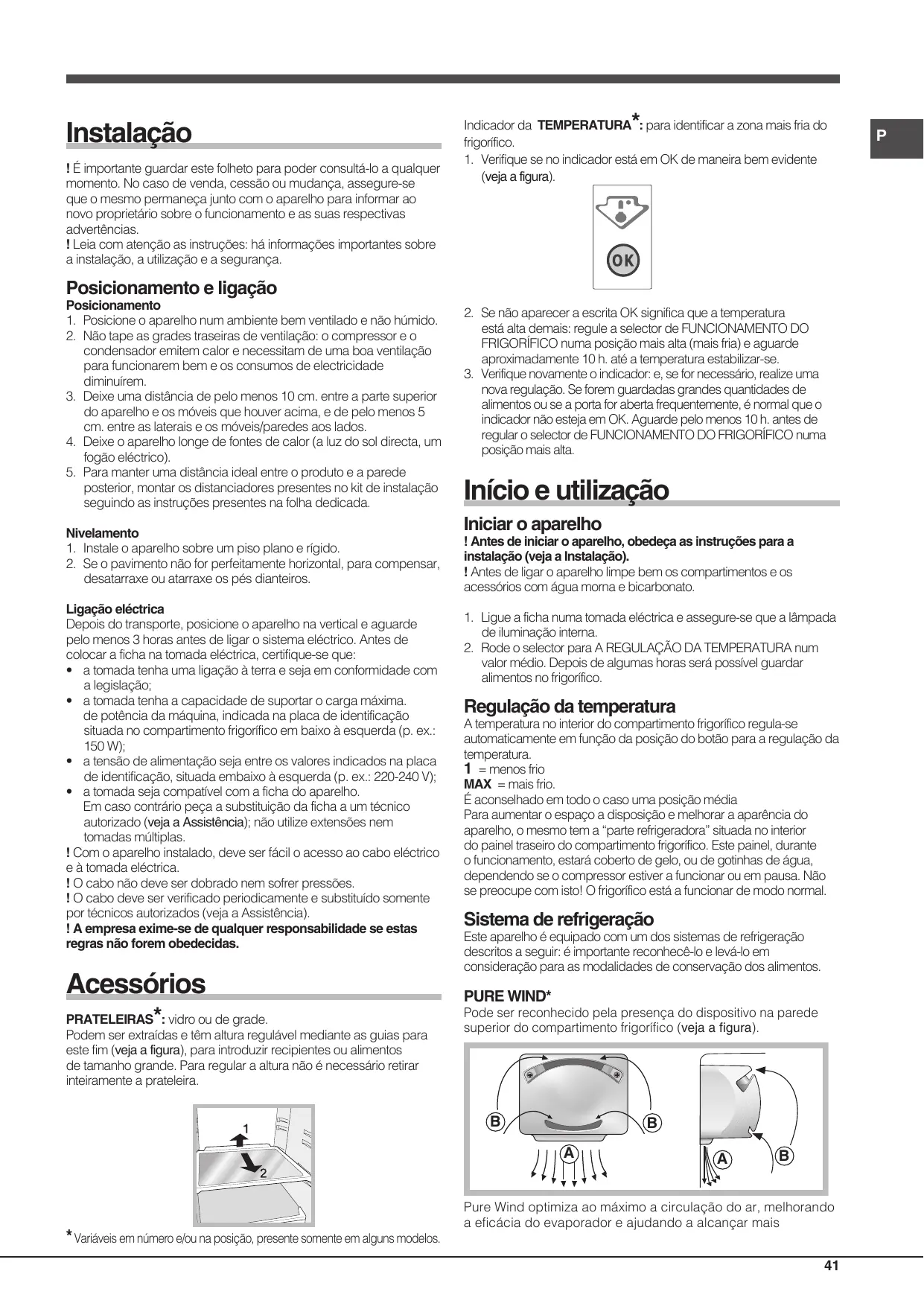 Instalação ! É importante guardar este folheto para poder consultá-lo a qualquer momento. No caso de venda, cessão ou mudança, assegure-se que o mesmo permaneça junto com o aparelho para informar ao novo proprietário sobre o funcionamento e as suas respectivas advertências. ! Leia com atenção as instruções: há informações importantes sobre a instalação, a utilização e a segurança.