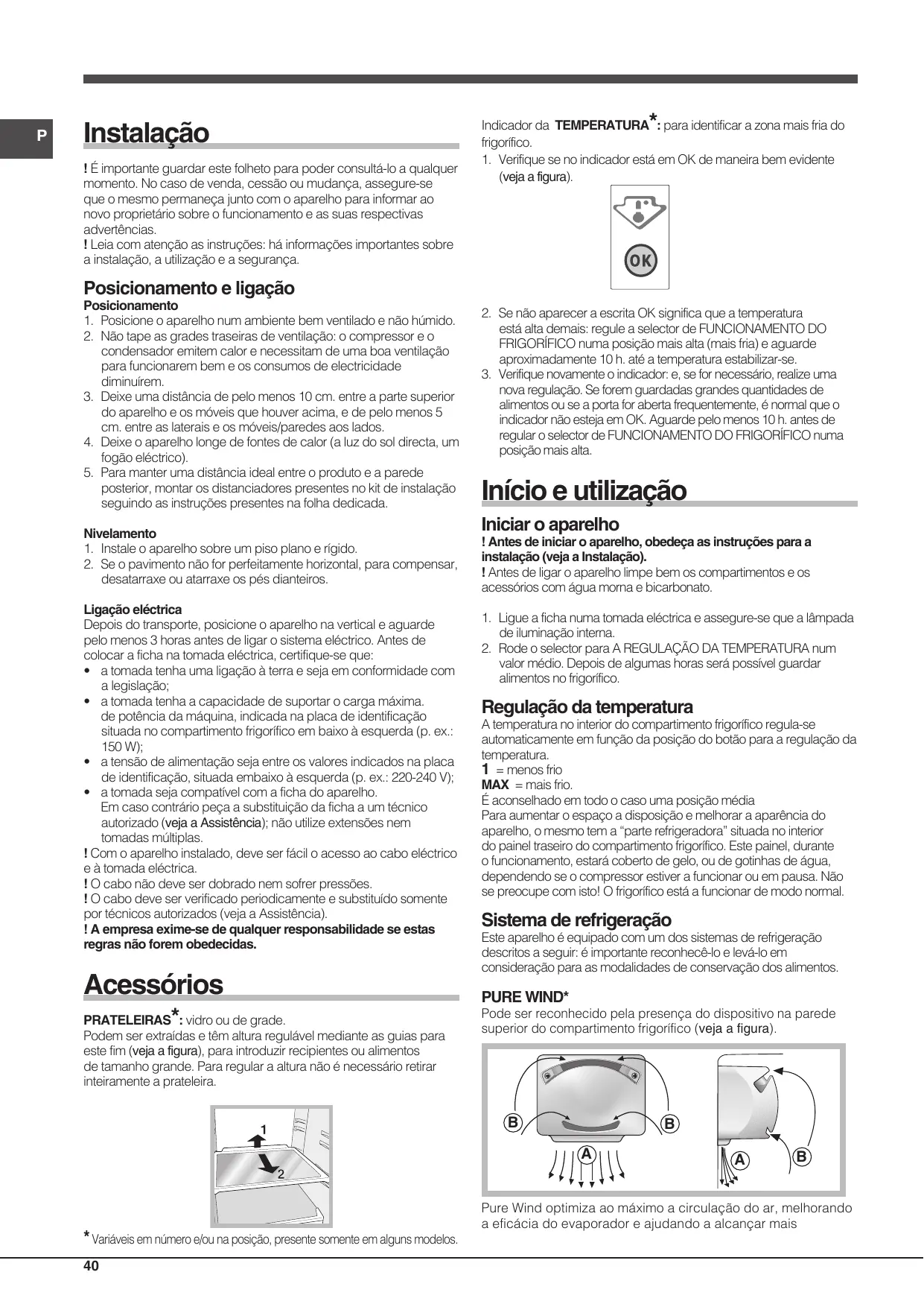 P Instalação ! É importante guardar este folheto para poder consultá-lo a qualquer momento. No caso de venda, cessão ou mudança, assegure-se que o mesmo permaneça junto com o aparelho para informar ao novo proprietário sobre o funcionamento e as suas respectivas advertências. ! Leia com atenção as instruções: há informações importantes sobre a instalação, a utilização e a segurança.