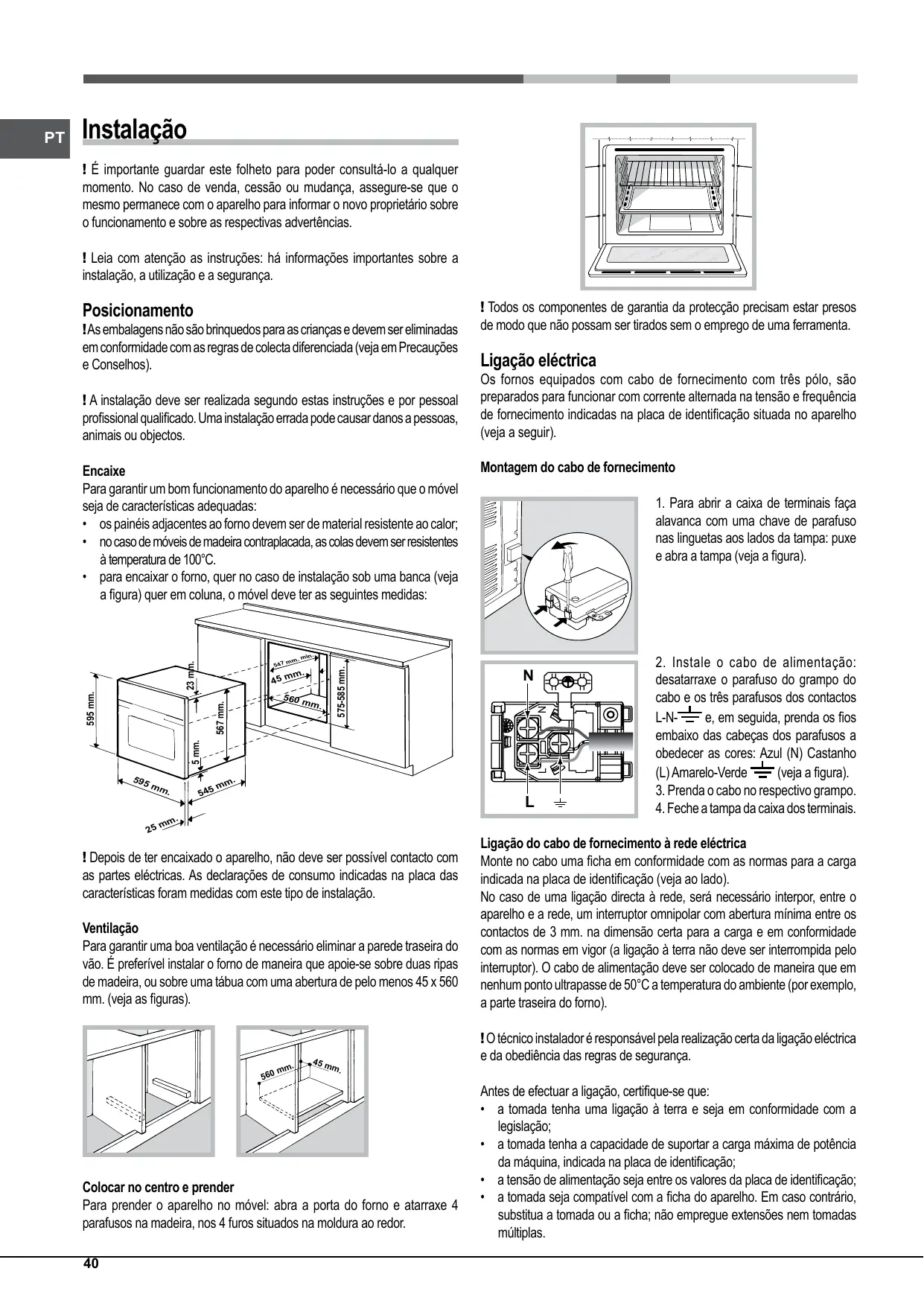 - para encaixar o forno, quer no caso de instalação sob uma banca (veja a figura) quer em coluna, o móvel deve ter as seguintes medidas: Ligação eléctrica Os fornos equipados com cabo de fornecimento com três pólo, são preparados para funcionar com corrente alternada na tensão e frequência de fornecimento indicadas na placa de identificação situada no aparelho (veja a seguir). Montagem do cabo de fornecimento